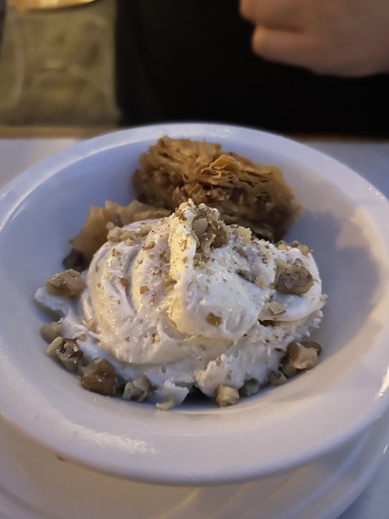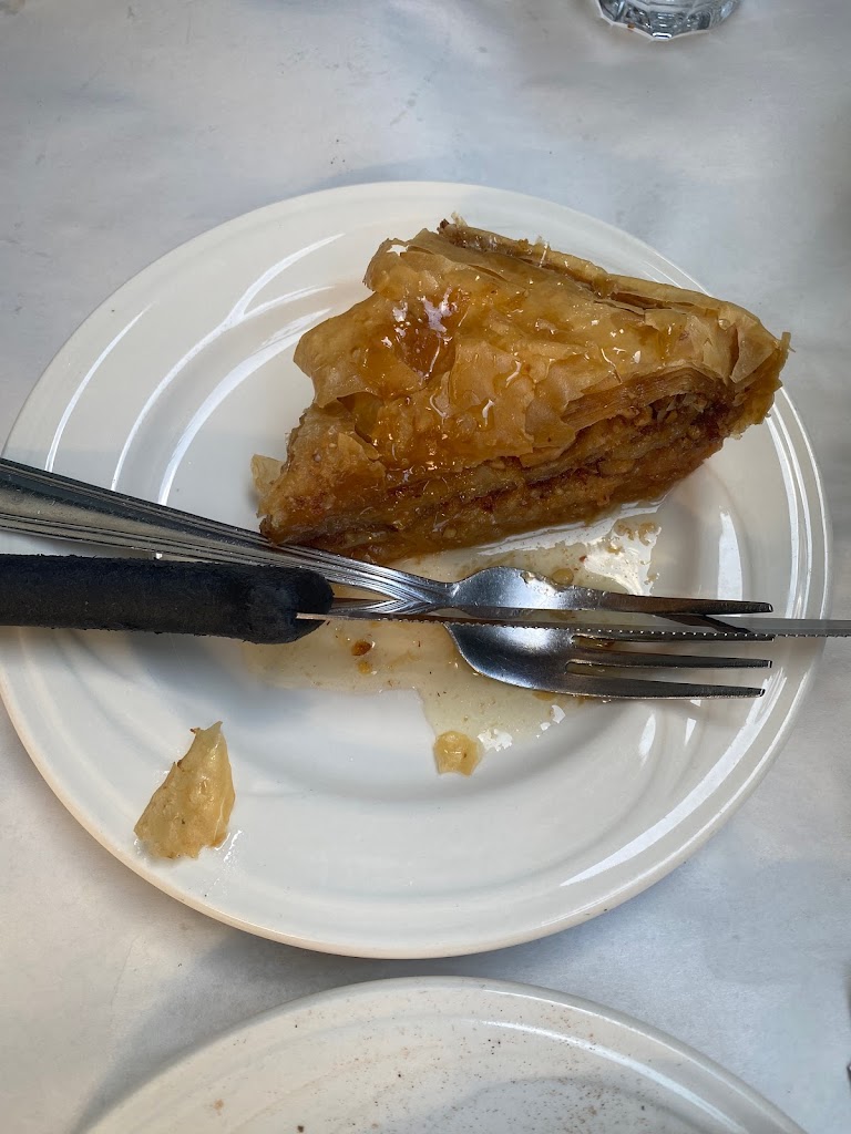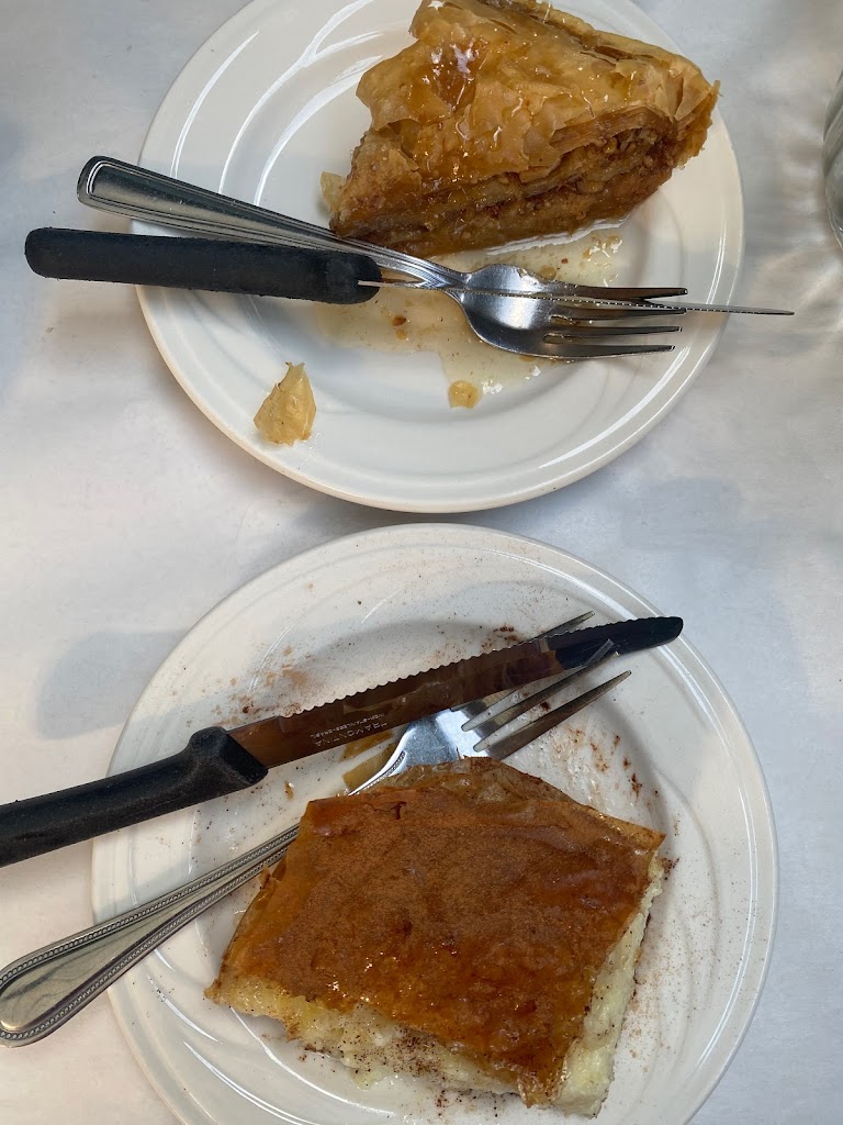 We went there for late lunch and the food was unbelievably yummy! We got shrimp skewer and that was delicious! The shrimp was grilled so perfectly! We also got baklava and galactobouriko for dessert and they were average! Overall, the main dish is so good and highly recommend their main dishes! We sat on the terrace and the atmosphere was very chill and relaxing. The staff were super nice too. Highly recommended!