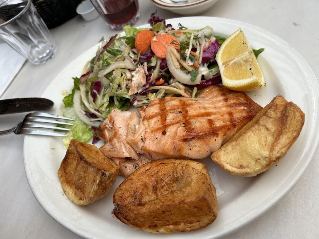 There were two of us. As a main meal, I had a Pikilia starter for two and my friend had the salmon with salad and rice. According to her, her meal was excellent as always. The salmon was cooked to perfection and the salad was tasty. My Pikilia was also very good as usual, but instead of being at room temperature, everything was ultra cold, even the plate, so obviously the dish had been prepared in advance and probably refrigerated a few hours before. The tomatoes were so cold they were almost frozen, so I suggest you specify that you want your food served at room temperature,