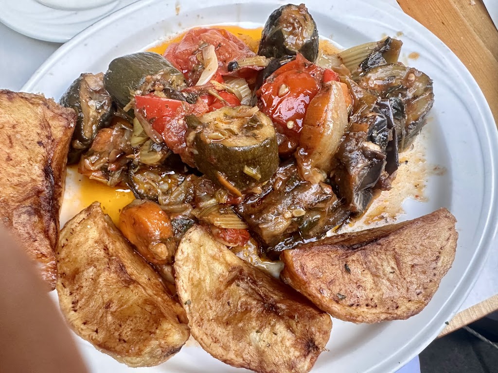 My husband is gluten sensitive and we are both vegetarian. We had a delicious meal here. Started with the halloumi and eggplant salad. Then he had the ratatouille and I had the Greek village salad. Everything was super delicious and fresh. The outdoor courtyard was lively and charming. Considering going back for another meal during our short trip!