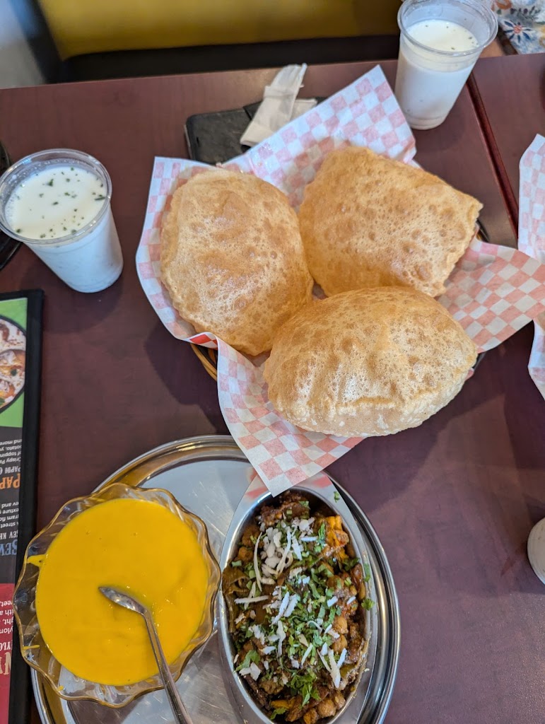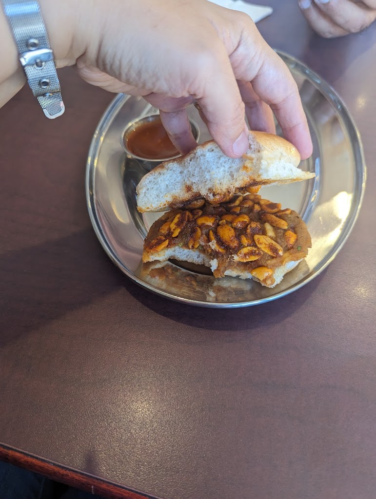 Everything was delicious with real Indian flavors! The sev khamani was delicious, vadapav and dabeli were perfectly spiced, and the chhas was so refreshing. Bajri no rotlo with baingan bharta was a great combo, and the dal fry with rice was comforting.