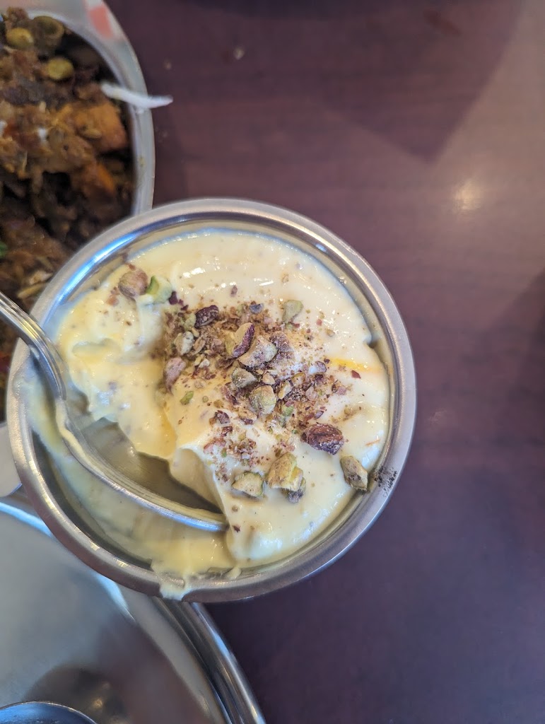 The food was delicious. I had Kadhai paneer with paratha and mango shrikhand. Overall a great experience.
