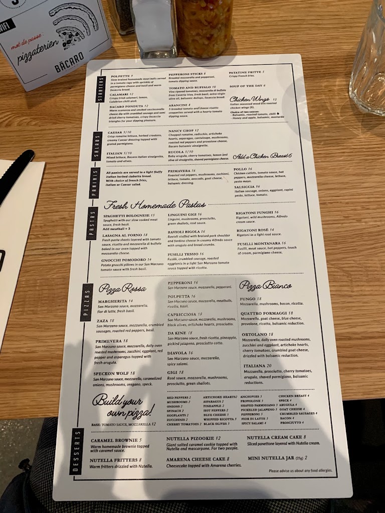 BÀCARO Pizzeria est un restaurant-bar de style italien où vous pouvez déguster la meilleure pizza en ville! Inspiré par les restos des quartiers de Venise où les habitants se rencontrent pour une petite bouchée et un bon verre pour célébrer la belle vie et les bons amis. Notre pizza italienne authentique et nos pâtes cuites au four sont faits d’ingrédients locaux les plus frais ainsi que d’aliments de qualité supérieure importés de l’Italie.