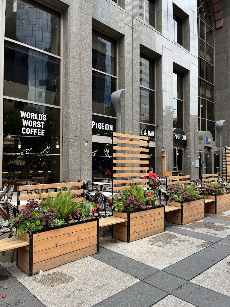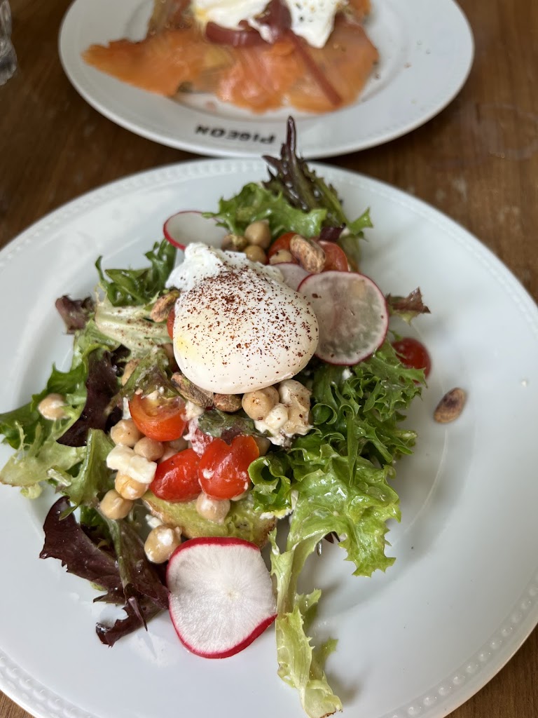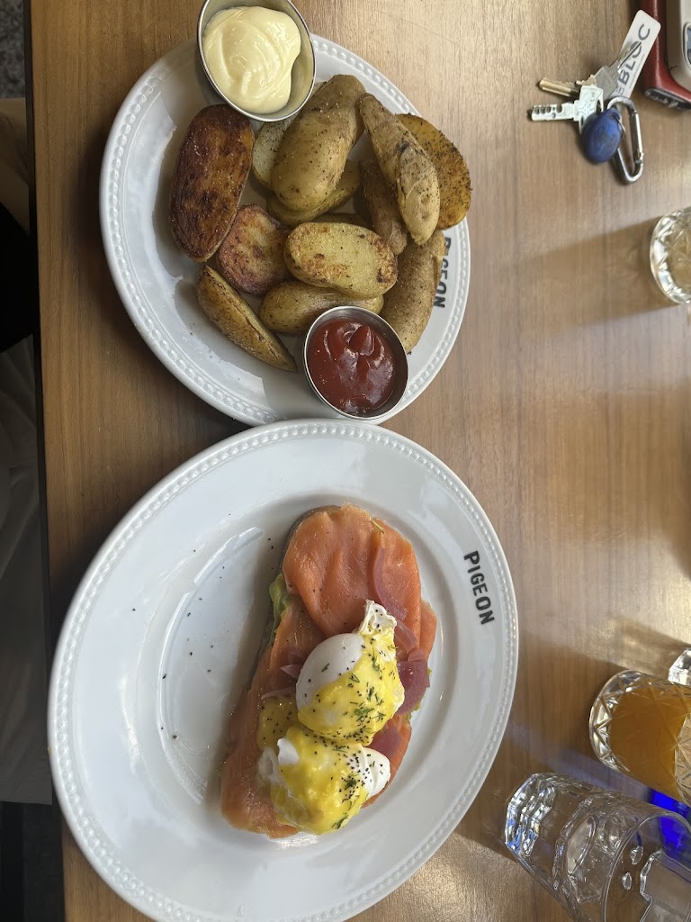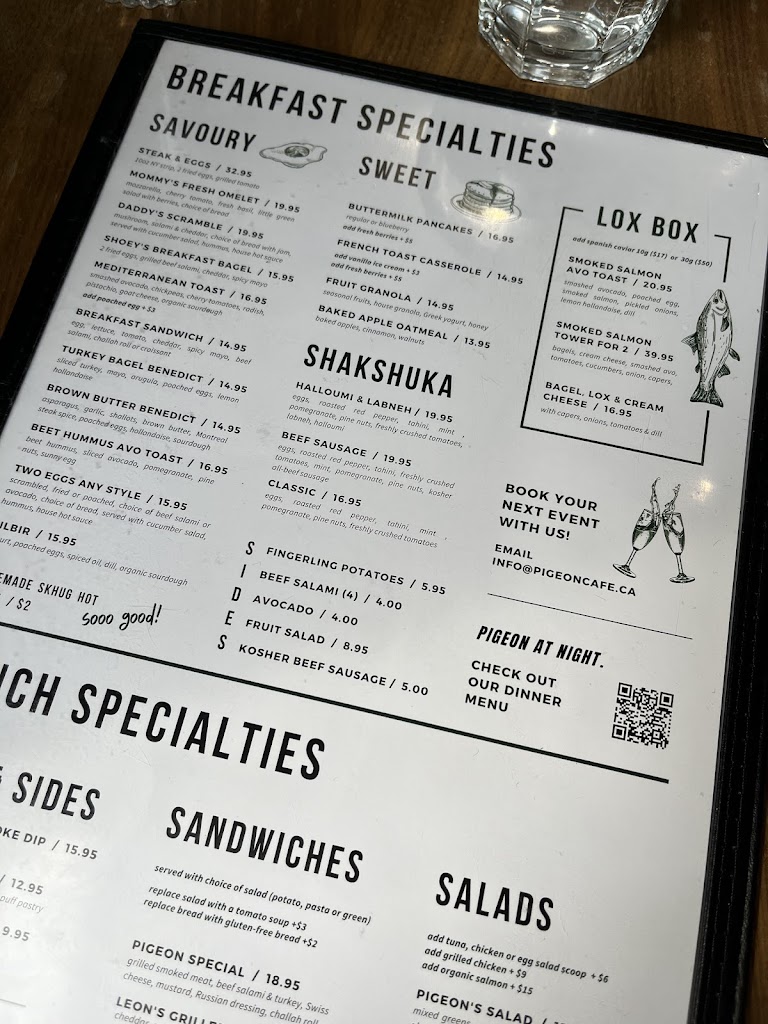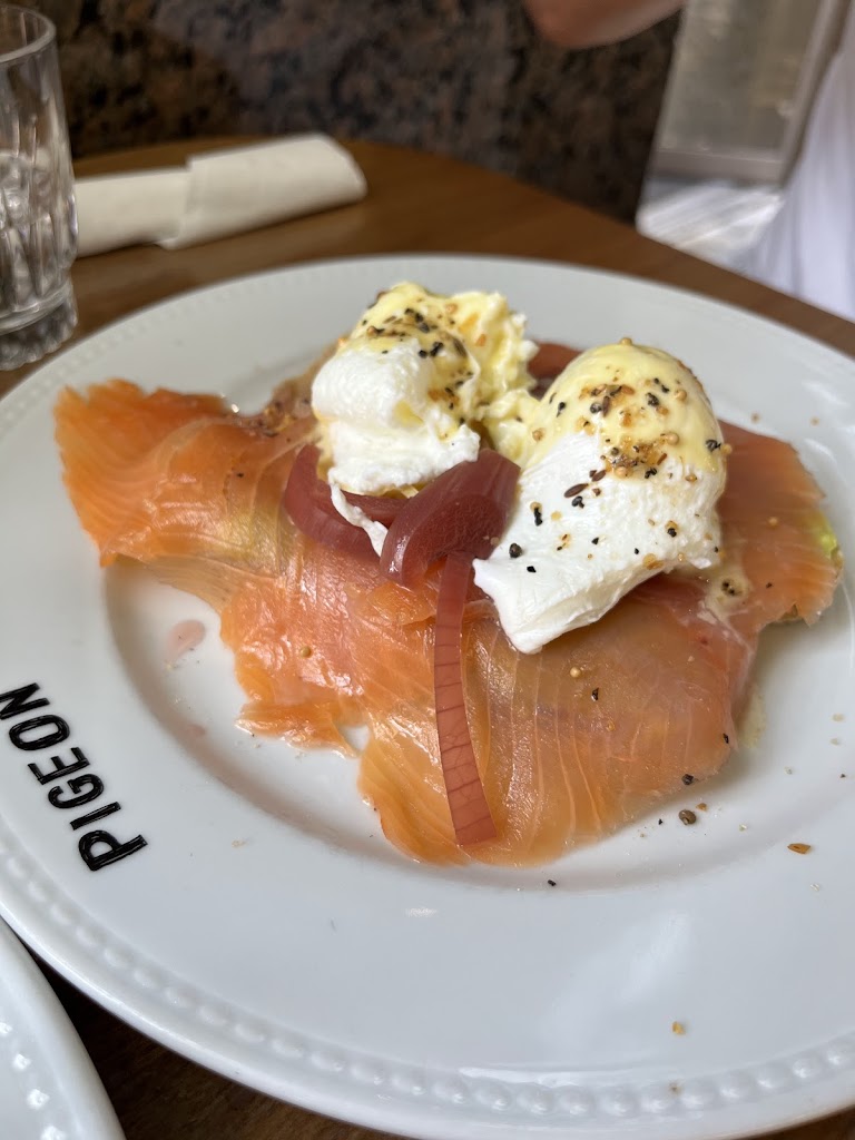 Pigeon Café : Great deco, Beautiful, makes you wanna stay for a coffee and more but Way too loud for a brunch place, had to shoot for people at my one table to hear me Food is ok, to not say tasteless , but waaaay overpriced for the quantity. 20$ for a bagel with cream cheese, you would expect a plate of bagel, nope ! One single bagel. service non existent. Had to call our waiter the whole service for putting in the order, didn t received it all. It s all pretty on the surface but nothing worthy when you dig a bit and expensive !