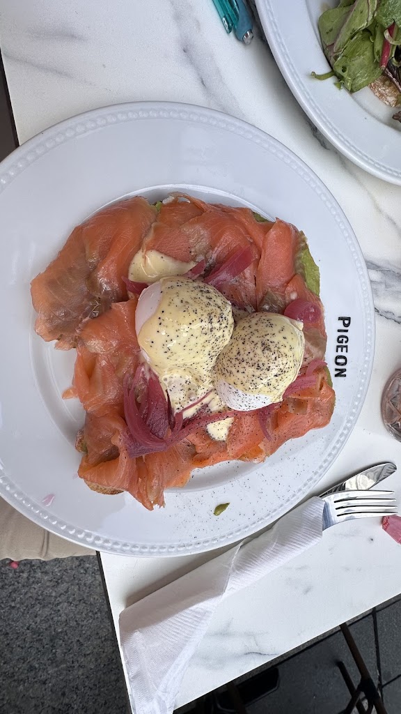 I had a delightful experience at Pigeon Coffee and would easily give it five stars. I enjoyed a cappuccino and a lox bagel, both of which were excellent. The bagel was particularly impressive; for $16.50, it came generously topped with a good amount of lox, making it a great value for the price. The cappuccino was rich and well-made, complementing the bagel perfectly. Despite being quite busy, the café has a charming atmosphere that makes it a pleasant place to relax. The service was a bit slow due to the crowd, but the overall experience was worth it. I d definitely recommend Pigeon Coffee for a cozy and satisfying café visit!