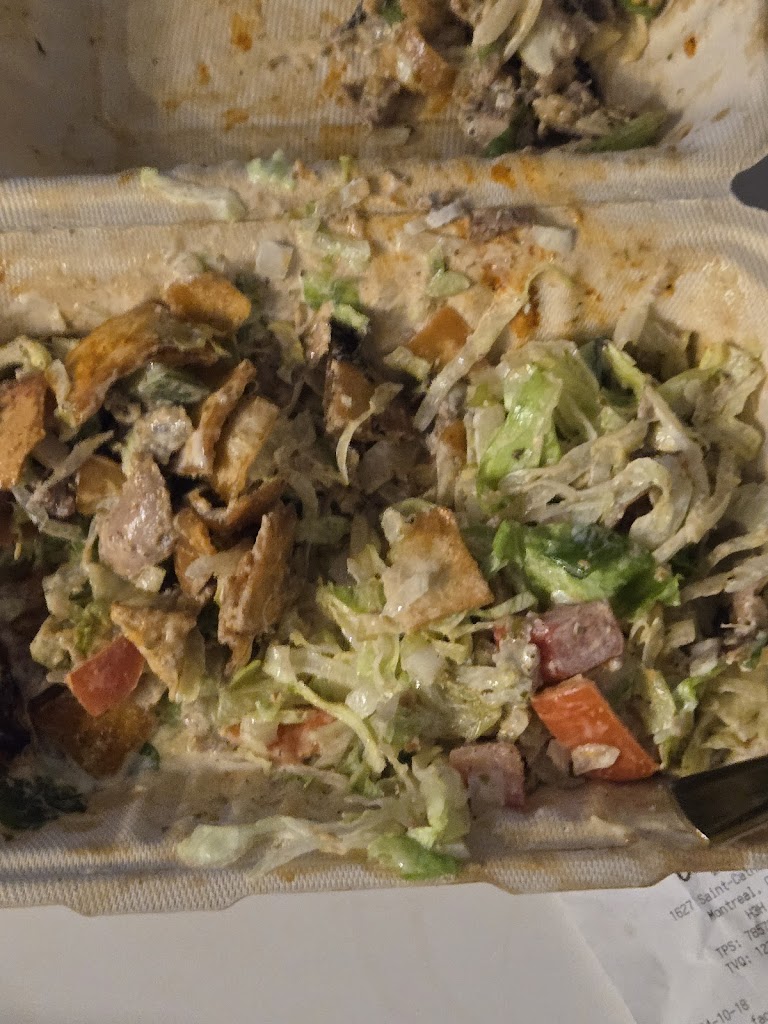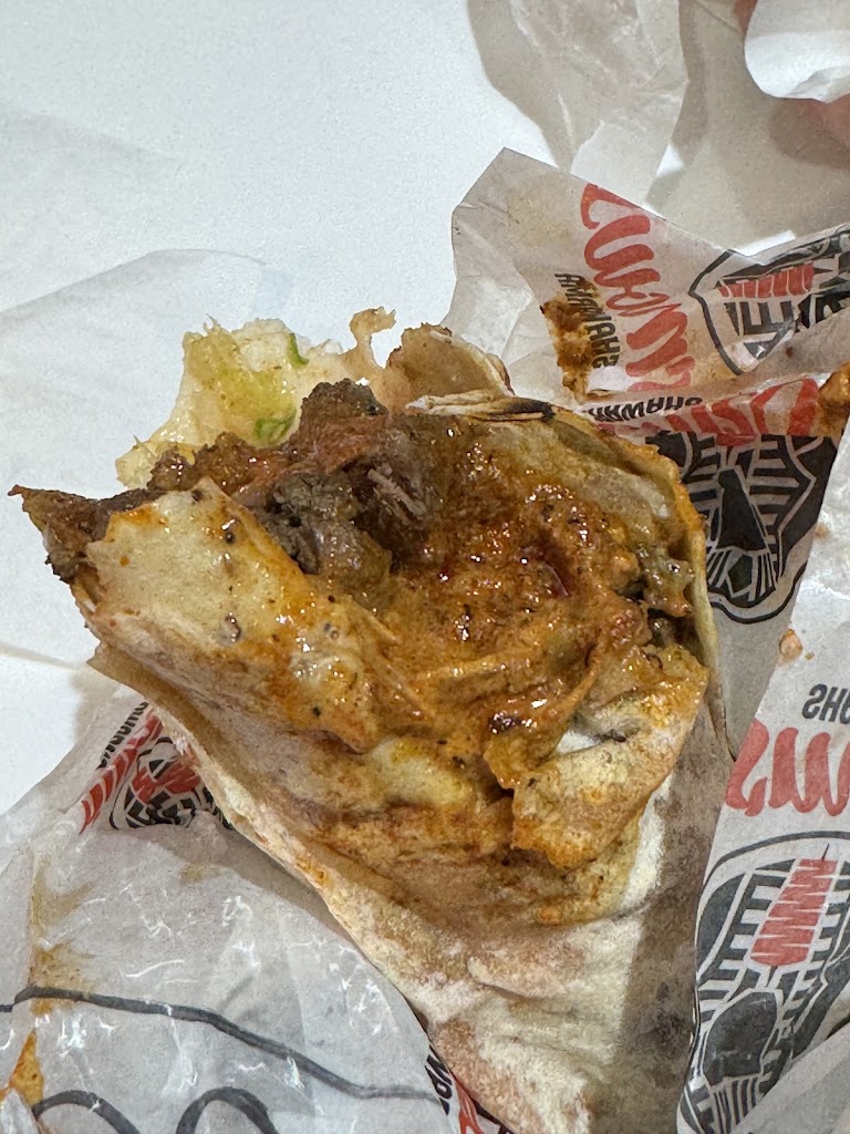 I asked for hot because it was in the middle of the hotness graphic shown to me, with an approximately equal number of levels above and below it, HOWEVER this was the hottest shawarma I have ever been handed. I finished trying to eat it 20 minutes ago and I still can’t taste my bubble tea. Aside from that the flavour wasn’t very good from what my partner thought. Maybe the hot sauce bottle exploded on mine, I don’t know!
