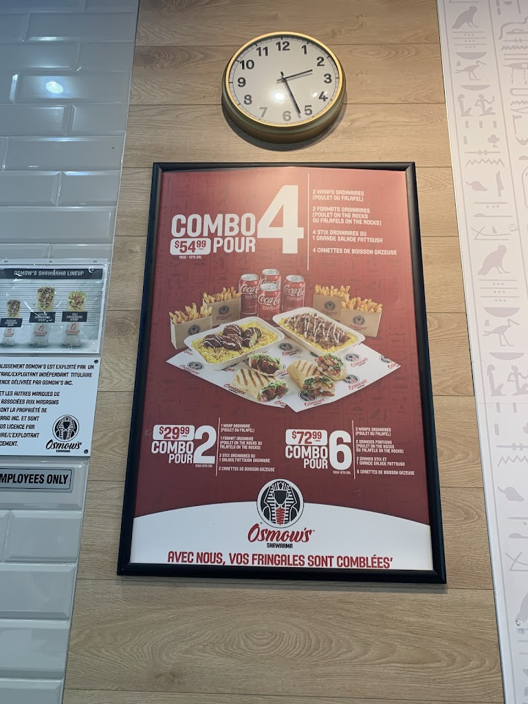 Osmosis is a decent place to try Arabic food. Here is my review and insight on this establishment. 15 June, 2024 Pros: A) The location is perfect since it s in downtown. B) The Lady who was at the cash was nice and friendly she spoke French or English although French needs improvement. C) The Food was alright nothing to fancy but decent at best and good with flavour. Cons: A) The restaurant is quite small so limited seating there as they perdere takeout. B) The music was a Bluetooth speaker behind a tv that was not working and it was a bit loud for me but nothing serious. C) The lady told me that the Philly chicken on the Rocks was not possible and I was sad because I wanted to try that instead I ordered Chicken on the rocks. D) No washrooms or bathrooms but the restaurant looks clean and you can see employees working hard and doing their part. All in all it s a good decent place to try. I want to try their specialties and other foods in the near future. I would recommend.