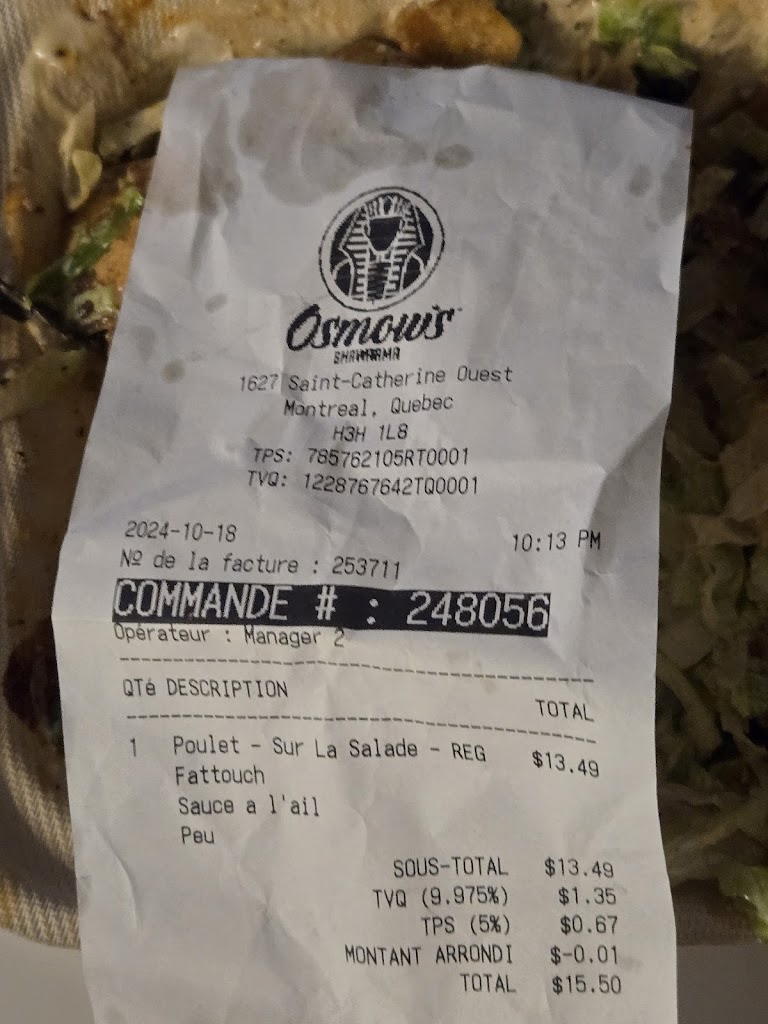 Update: 22nd August 2024 order placed 11:25 pm I have ordered a Poulet Shawarma Moitie-Moitie with pita croutons it was cold and bad condition The Pita Croutons were soft and soaked. The chicken and fries were cold as hell. Does feel fresh at all. Not at all satisfied. I paid 21$ for it not even worth a penny it used to be 15$ with tax and was good in taste Old Review: I initially ordered the Chicken Half & Half from Osmow's and really enjoyed it. However, my subsequent experiences have been extremely disappointing. Over time, both the quality and quantity of the food have significantly decreased. The Chicken Half & Half, which should include rice, fries, and chicken, often arrives with just rice and pita croutons, with the chicken missing entirely. This has happened multiple times, and it's deeply frustrating. Additionally, my orders from Osmow's frequently get stolen or take more than 90 minutes to arrive. This issue seems specific to orders from Osmow's, raising concerns about their staff's attention to detail and care in handling orders. It’s disheartening to think that my orders are being mishandled or not properly verified. These consistent problems have left a very negative impression on me. I didn't want to report this and put Osmow's in a bad position, but someone has to speak up. This review is purely from my perspective as a deeply disappointed customer. The food used to be great, and I loved it, but not anymore. I even tweeted to Osmow's on X (formerly Twitter) about these issues, but I never received a response. This entire experience has been very hurtful and disheartening.