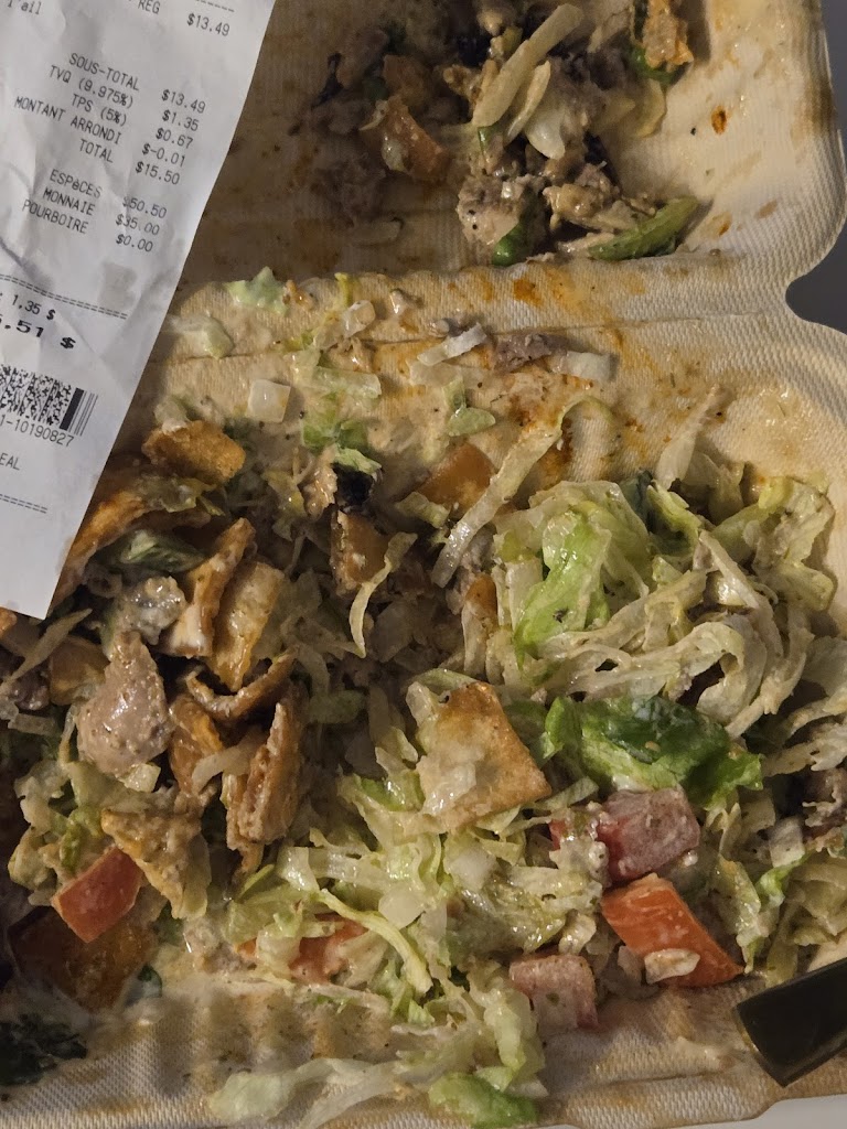 Came here all the way from Gatineau and was expecting a classic shawarma place. NOPE! This was beyond yummy. Ill definitely come here again next time Im in mtl. I got the chicken salad and let me tell you... DE-LI-CIOUSSSSSS i asked for no dressing and lots of garlic sauce, and I was so pleased. Yummy. 5+ stars