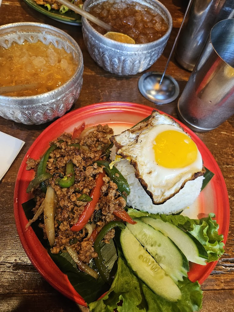 The pad see ew was really good. The texture of the noodles were the highlight, retaining a bit of chew compared to a lot of other pad see ew place. The pad kra pow was also really good, but the heat was missing. I don't think they used thai chilies so it was slightly disappointing. The Thai milk tea and the Thai lemon tea were both delicious.