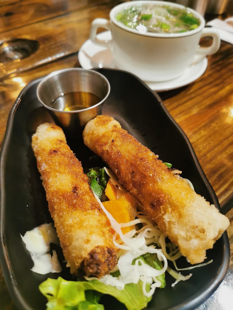 Spicy lemongrass soup with good ingredients, good quantity. I dont like stainless glasses. Imperial rolls, too much breading. Very fair price