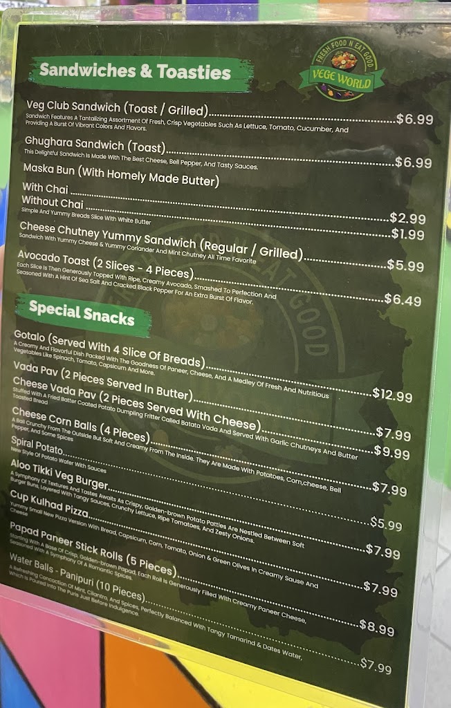 I had an amazing experience at Vege World,The vadapav and ghughra sandwich were both absolutely delicious. The vadapav was perfectly spiced, with a great balance of flavors and a soft, fresh bun. The ghughra sandwich was so flavorful, and so satisfying, i will be coming back for more. Highly recommended !