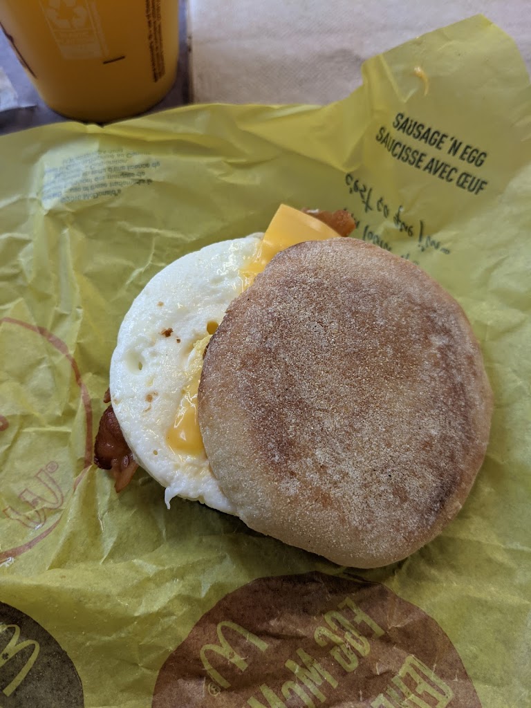 This is one of the worst McDonald's I've ever been to. Last time I was here I waited forever in the drive thru for a breakfast sandwich. The egg was undercooked in the middle. Today I ate in. I ordered a bacon and egg McMuffin combo with apple juice. The server was so rude in the way she said they don't have apple juice. You can look at the photo to see the state of the sandwich. When we were handed our order I asked for ketchup. Despite handing me the ketchup another employee told me that I have to ask for it at the time I order. I have triple checked the ordering counter and there is not one sign anywhere saying to ask for condiments ahead of time. Finally the tables are filthy. We are still in a pandemic and nobody can be bothered to keep the area clean.