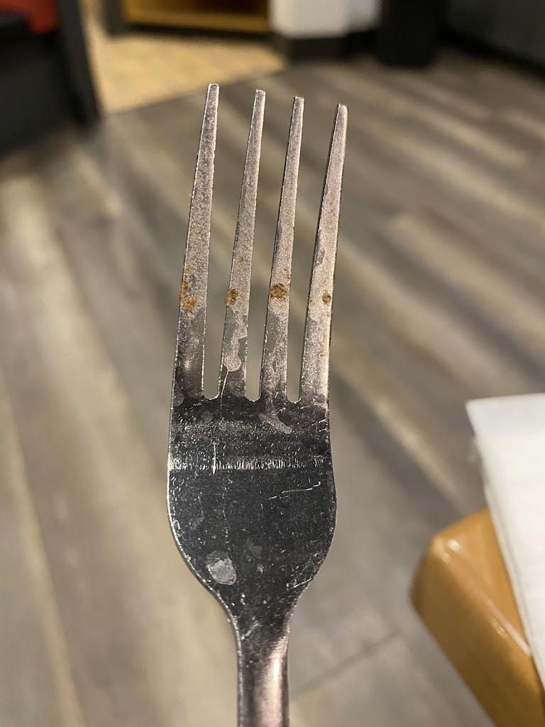 Just home after a less than stellar dining experience at Pizza Delight, Mt. Pearl. The restaurant wasn’t busy (two booths occupied, along with a few tables in the small party room) and we were seated quickly. My husband ordered a draught beer, and when he got to the bottom of the drink, there were a number of things floating at the bottom of the glass. Showed the server who agreed it was disgusting, and she poured it down the sink near our table; didn’t mention it again. Our food came out about 10 minutes later, and we opened the cutlery. Two of the three sets of cutlery couldn’t be used as they were filthy; the set my daughter used was okay. Had to wait to get the server’s attention so we could get more cutlery; she brought three more sets and the second one I opened was worse than the first. By the time the cutlery was sorted, the pizza was not nearly as hot as it should have been and while not affected by temperature, the Caesar salad was disappointingly bland. We were never asked how the food was, my husband was never asked if he wanted anything else to drink. When we were paying for our bill, we asked if she had mentioned the issue with the glass/beer to a manager and was told she hadn’t, but she would. I’m not convinced it will ever be mentioned, so I hope one reads this review. Photo is fork from the second cutlery packet: wish I had my time back and had taken a photo of the bottom of the glass. This was the third time eating at/from this location, but quite likely my last.