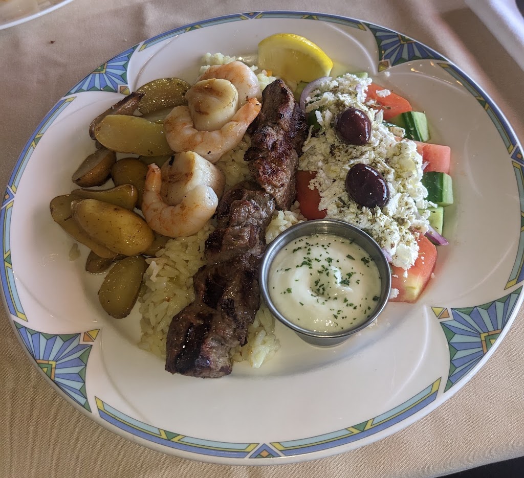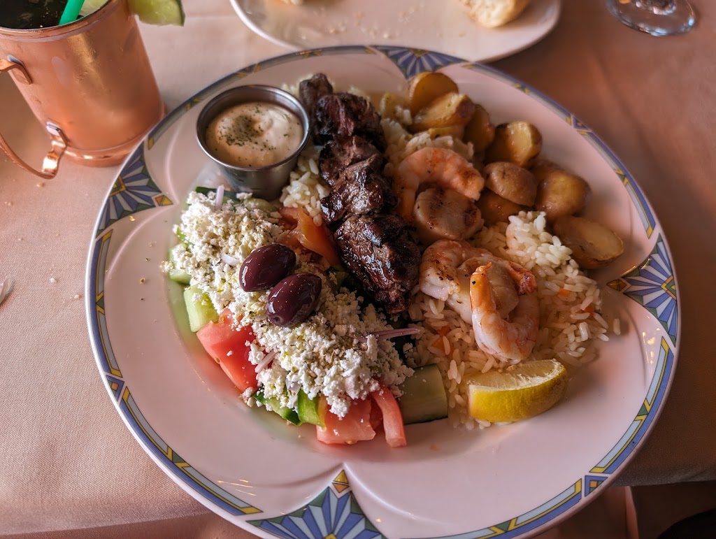 Surf and turf souvlaki.. first time going to Zouglas and very happy we did. It was our anniversary dinner and the service was lovely , complimentary fresh bread was delicious as was the dinner itself. Loved the fingerling potatoes, fresh Greek salad, and the rice was one of my favorite components. Proteins were cooked perfectly and I liked the opportunity for a bit of variety with the surf and turf option (as someone who can never decide between so much good sounding stuff lol) hubby absolutely loved his lemon herb salmon as well. Will go back for sure