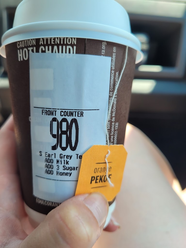 We stopped in for a pee break and some takeout. I was so excited to enjoy a tea on our journey, only to realize they put the wrong bag in and no honey😔