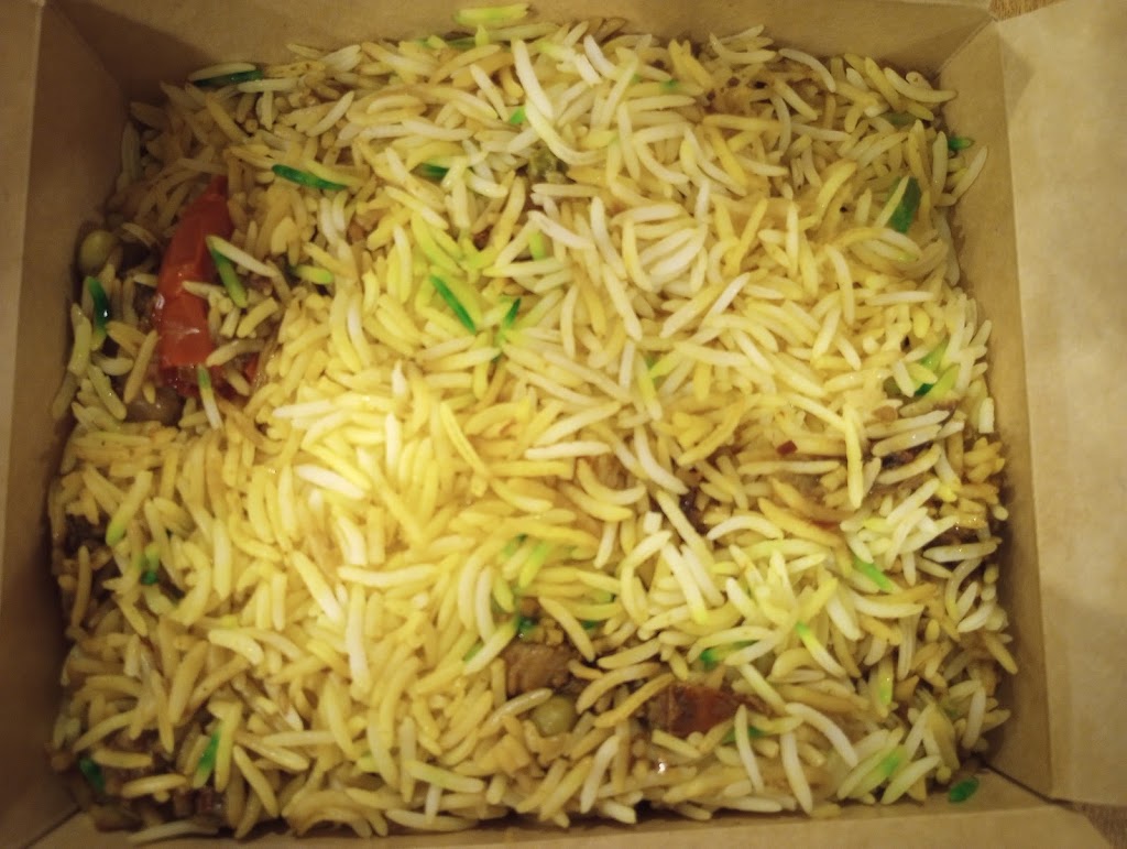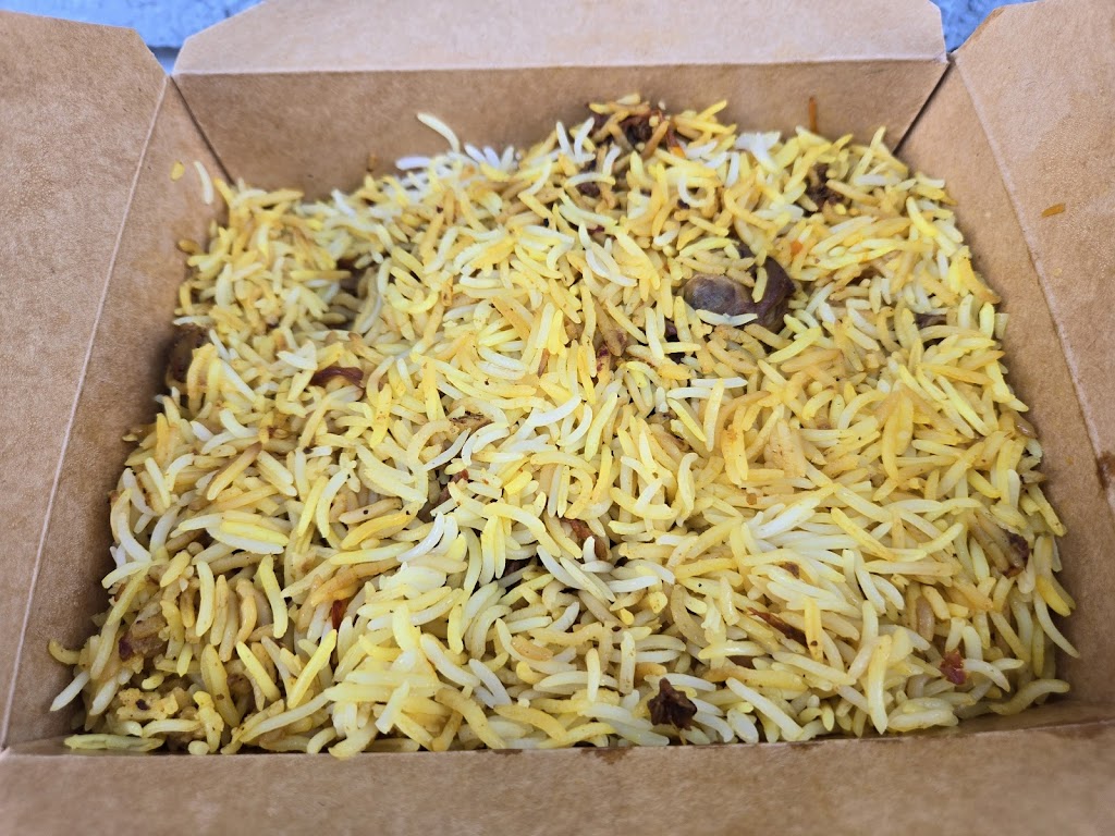 Came here for lunch, service was very friendly and pretty quick. Ordered the chicken biryani because it smelled so good in the store. The portion was good for the price, the package was quite hefty. As someone else also said, they did use food coloring in the rice which feels unnecessary to me. I also found 2 hard fruit pits in the rice. Im not sure exactly what kind, maybe an apricot or something, but at first I thought it was a piece of chicken bone I accidentally bit into, but it was a hard pit of some kind of stone fruit I think, and then there was a second one as well. Certainly not expected. Vegetarian options: They have a vegetarian biryani Dietary restrictions: They are largely nut free, and have dairy free options.