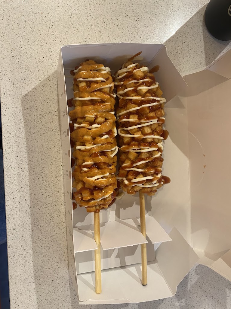 The potatoes outside looked so burnt, but the one who did my sauce said no. But when I tried, it s actually burnt the rice dog was pretty dark even before the sauce was on it Ps. the guy who took my order was pretty nice though