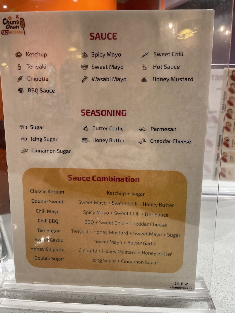Chungchun offers a delightful fusion of Korean street food flavors with a modern twist. Their volcano corndog toppings with sweet potato and spicy mayo is a MUST TRY!! Food
