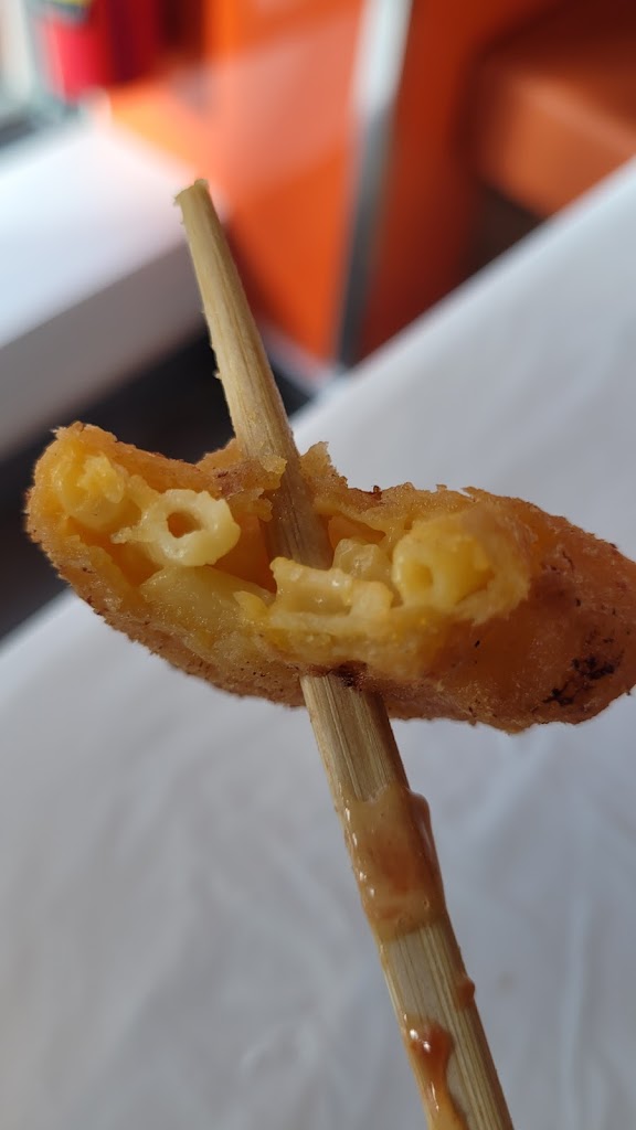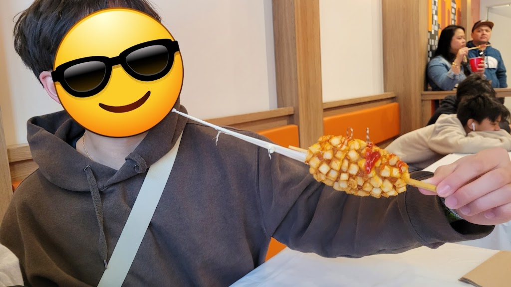 Lovely girl working alone today had great service and got us our food very fast. The assortment of sauces and seasonings are great. Yummy crispy rice dogs. I recommend getting the potato, it’s very filling. Mozzarella cheese is a good one too, but I don’t like the cheddar cheese as much (it’s sticky like American cheese). The establishment could be decorated better. There’s definitely space to have one more table or some barstools next to the pickup counter.