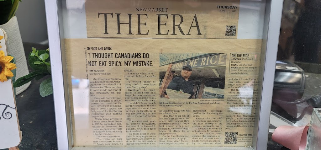 Undoubtedly one of THE BEST restaurants in Ontario...not just Newmarket! Not even kidding. My family and I drive all the way from Scarborough just to eat at On The Rice. Their food is AMAZING. The beef bulgogi and the spicy pork is our favourite. The meat is tender and delicious, their vegetables have that yummy grill flavour and are super crunchy, their portions are very generous, and their prices are reasonable. Their service is excellent -- always warm, inviting and attentive! They never miss a single detail of your order and are happy to serve you. I always look forward to eating On The Rice! Do yourself a favour and check them out!!! Thank you On The Rice team for always serving the best, freshest food. My family and I appreciate you all
