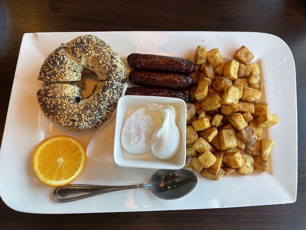 Great value for breakfast. Eggs and sausage were delicious. Service was friendly and attentive. Disappointed with my bagel, it was dry, and way too much butter. Will definetely try again, hopefully I get a better bagel next time.