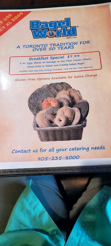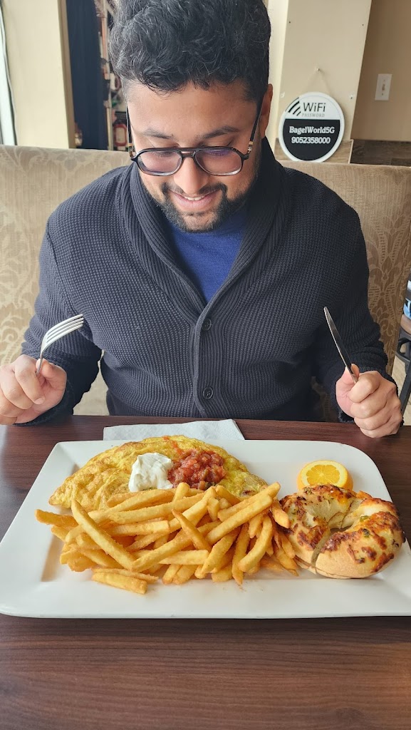 Bagel world surprised me with its warm welcome, affordable prices, plates are full and food is above my expectations delicious. I took a breakfast plate and brought food home there was so much, I usually dont do that at breakfast but was to good to leave for the garbage. The inside of the restaurant and washroom is a little dated, but would I return and recommend this place to the world, absolutely!!! I wish I had gotten the name of the young waitress that served us, she was amazing. No more big chain, to not mention any names, Bagel World is my new breakfast place. Looking forward to try more from there, lunch and take away treats.