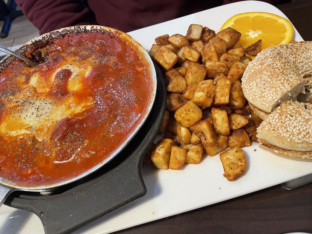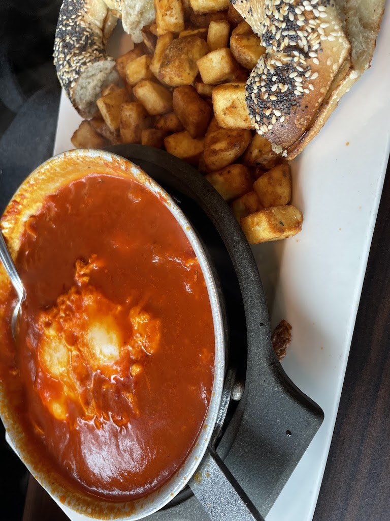 It was a perfect brunch place to celebrate Mother s Day. It was busy and they did only walk-ins but fairly so. The food was totally worth that wait. The Shakshouka ( eggs poached in a sauce of tomatoes, olive oil, peppers, garlic& spices with goat/feta cheese ) was one of the BEST I had in a long time. Their French toast and whipped cream was delicious, our son thoroughly enjoyed it. Home fries were perfectly crunchy yet soft and well seasoned. Of course their bagels were good too- we tried the pumpernickel & multigrain with sesame Service was great. Highly recommend it & we are definitely going back!