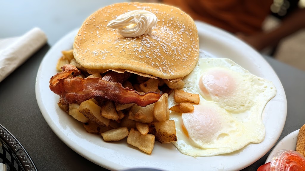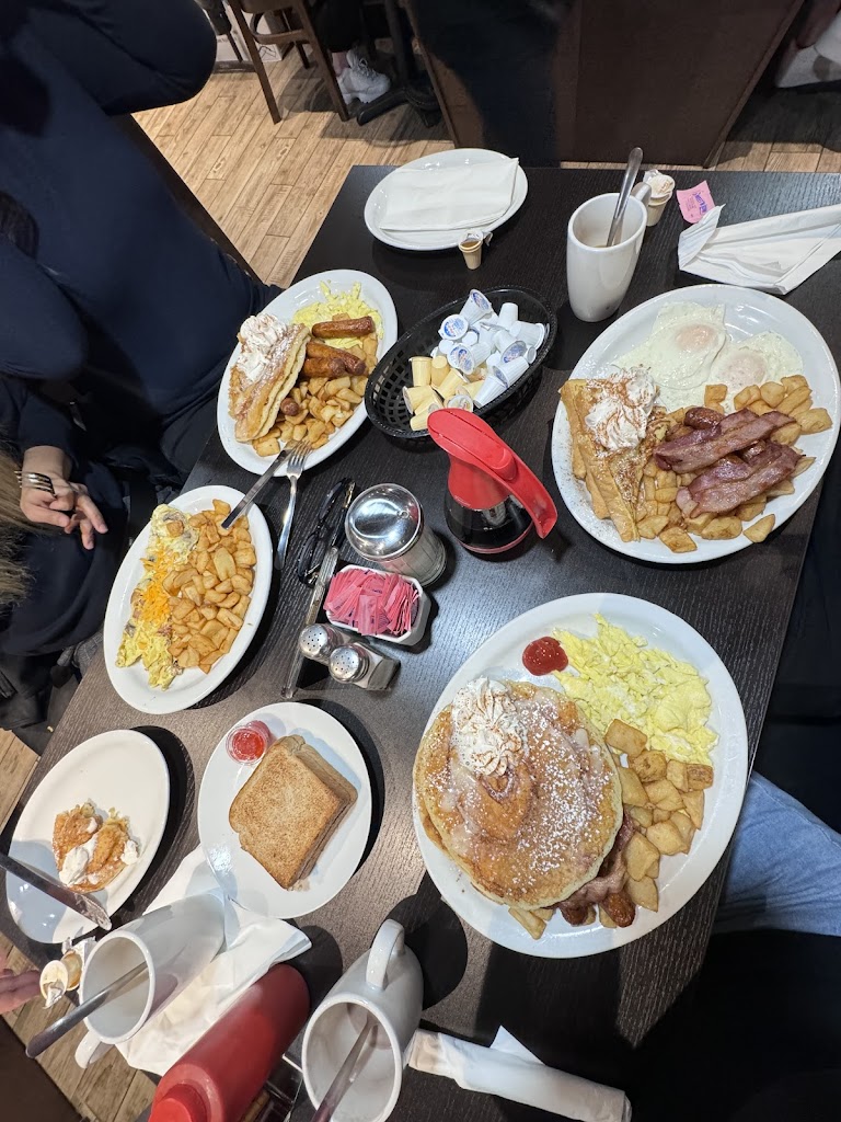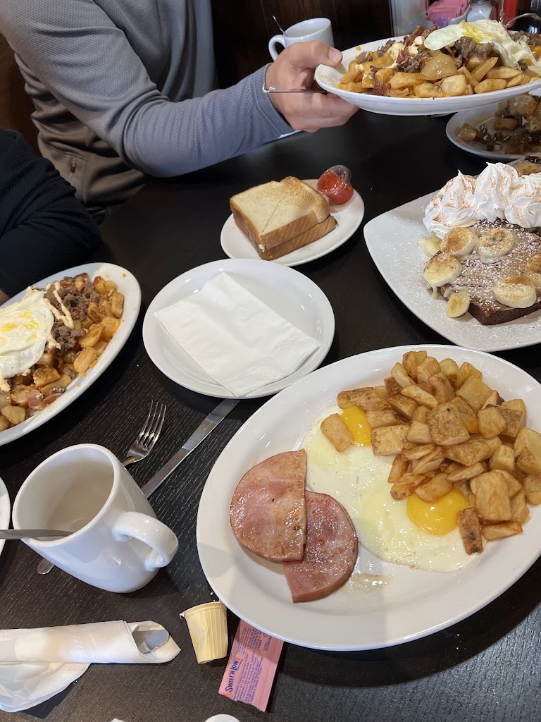 Food is large portions and decent price, unfortunately the quality and taste are not good enough for me to want to come back. The service was great with free coffee refills and attentive staff, all orders (6) came out quick with no issues. We came Sunday morning so it was very busy, but if u put in a reservation before u get there you can get a seat. Noisy and a bit crowded but that s unavoidable for a Sunday breakfast place. I got blueberry pancakes, they weren t light and fluffy like I was hoping for and the blueberries aren t that flavourful. My boyfriend got cheese burger hash, again it was fine. Tastes like potato with cheese and burger on it, nothing special. The omelette that my one friend got was good apparently so maybe stick with eggs if u come. Ok for a quick breakfast spot, definitely won t fix your craving if you re coming here for a delicious meal.