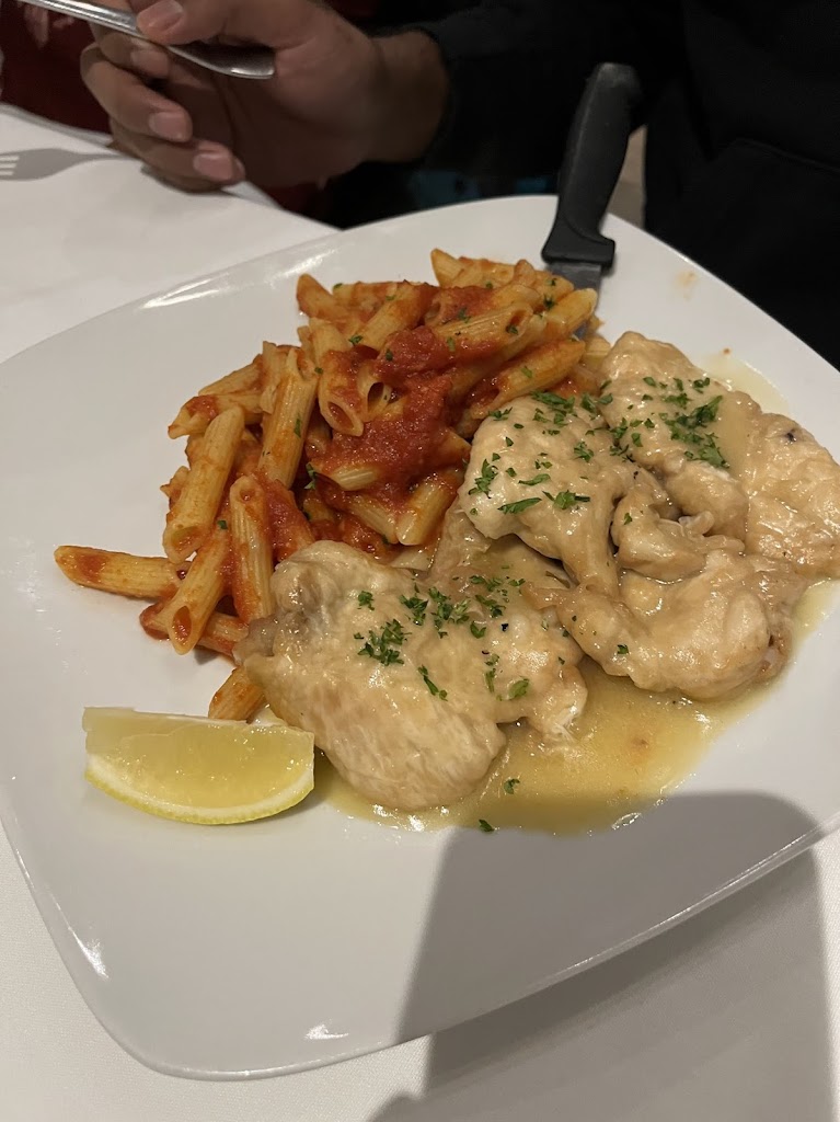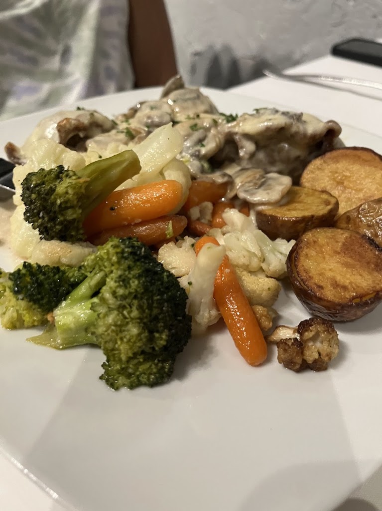 Food was very good, portion was lacking Option of pasta versus roasted potatoes, we picked roasted potatoes and received three half small baby potatoes Service was excellent but we were the only people in the restaurant besides an older lady with a young child.