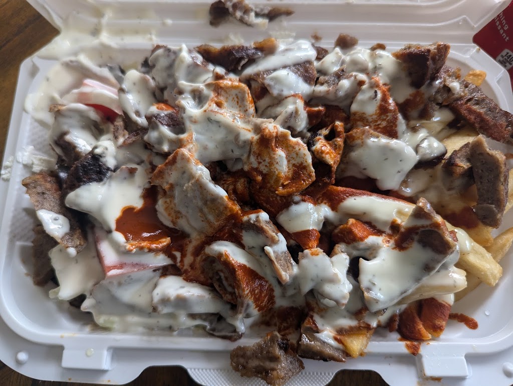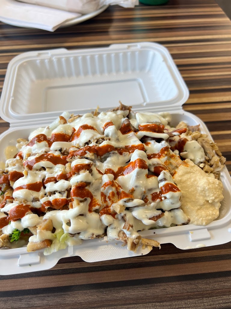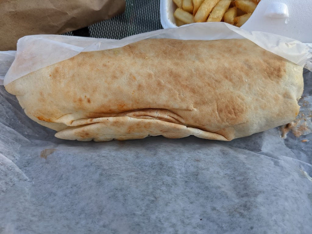 As other reviewers wrote, the portions are big here. I got the 8" chicken shawarma wrap with regular size fries and an order of beef on the sticks. My wife and I had to take a break to finish the meal. The food was definitely tasty and was surprisingly spicy. I will likely downsize the order in the future.