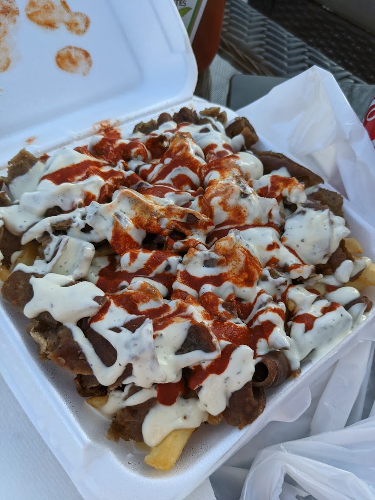 The shawarma was filling and had lots of toppings. I love that they add fries to it if you request as well. I heard they stopped offering eggplant as a topping. Having lived in the middle east and eaten this as a shawarma topping, I did it. Bring it back :) The hummus was yummy. Falafels were okay.