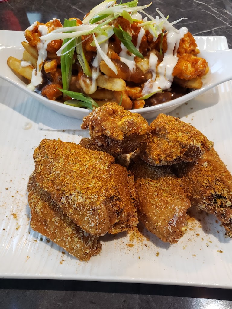 Came here for the first time with my boyfriend and overall it was a good experience and I would definitely come back. The only 2 suggestions that I have is to ensure that the appetizers are served before the main is served. My chicken wings were nice and saucy when they arrived to me, but unfortunately by the time I started eating them, they were as dry and hard as a rock, because I was eating the appetizer first. Additionally, it would be nice to have the option to turn off the TV at your table because its quite a distraction when youre trying to have a conversation with the people youre with. Otherwise, the poutine and perogies tastes really good.