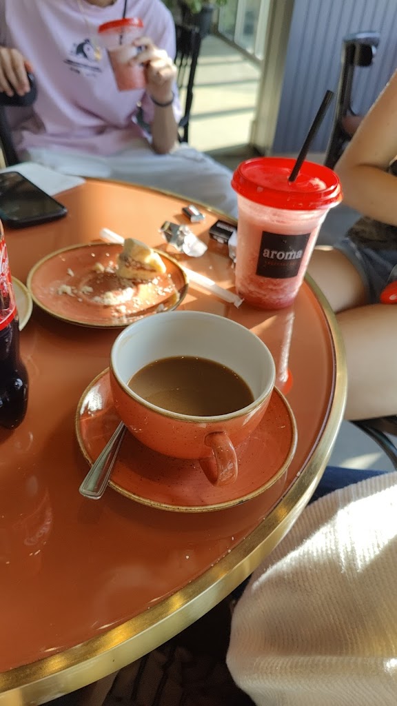 First time visiting an Aroma Espresso Bar. The place was pretty busy, and the line was fairly long, probably because I visited on a weekend. Based on todays visit, the service was okay, I only ordered an ice coffee , so I would expect it to be fairly fast? But the wait was pretty long, in my opinion, but again, it was probably due to the long line. Other than that, no were other issues or problems. I would visit again but on a weekday when its a lot more quiet