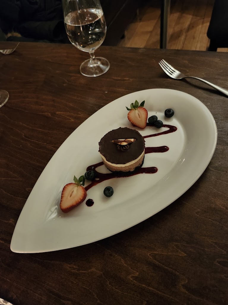 Cheese platter was very tasty but we ordered dessert and it was half our bill. Not impressed with a 17 dollar (x3) dessert and when I asked for the menu and was told they could just tell me what there is. If I saw the price I wouldnt have ordered any and went somewhere else. Guess Ill know not to make that mistake again. Not saying they were bad either. Size was small and the price was ridiculous.