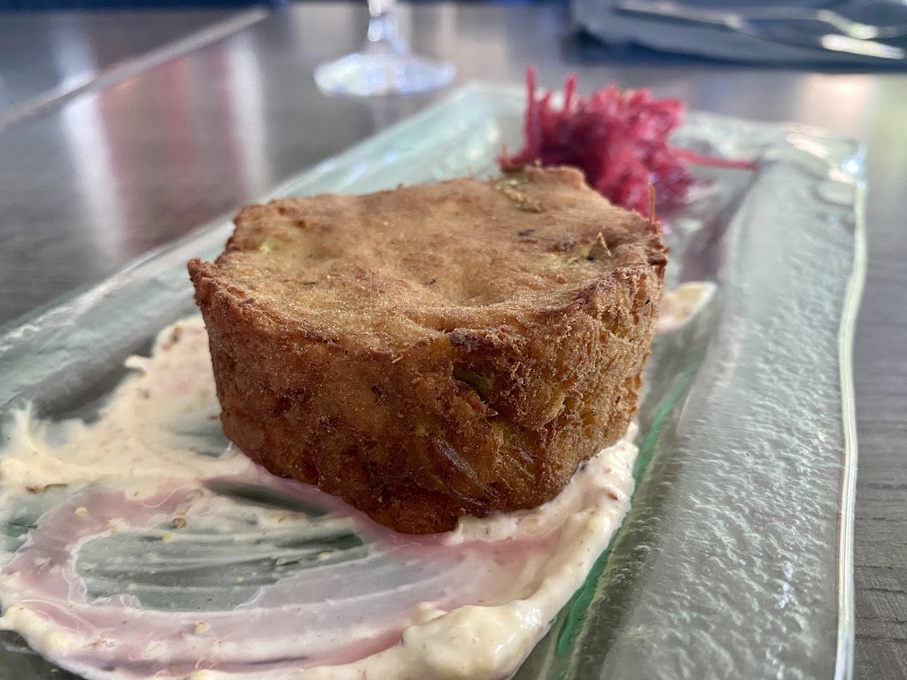 The waffle and fried chicken sandwich sounded better than the execution of the dish. Waffle was too soggy to work as sandwich bread. Crab cakes were only so-so.