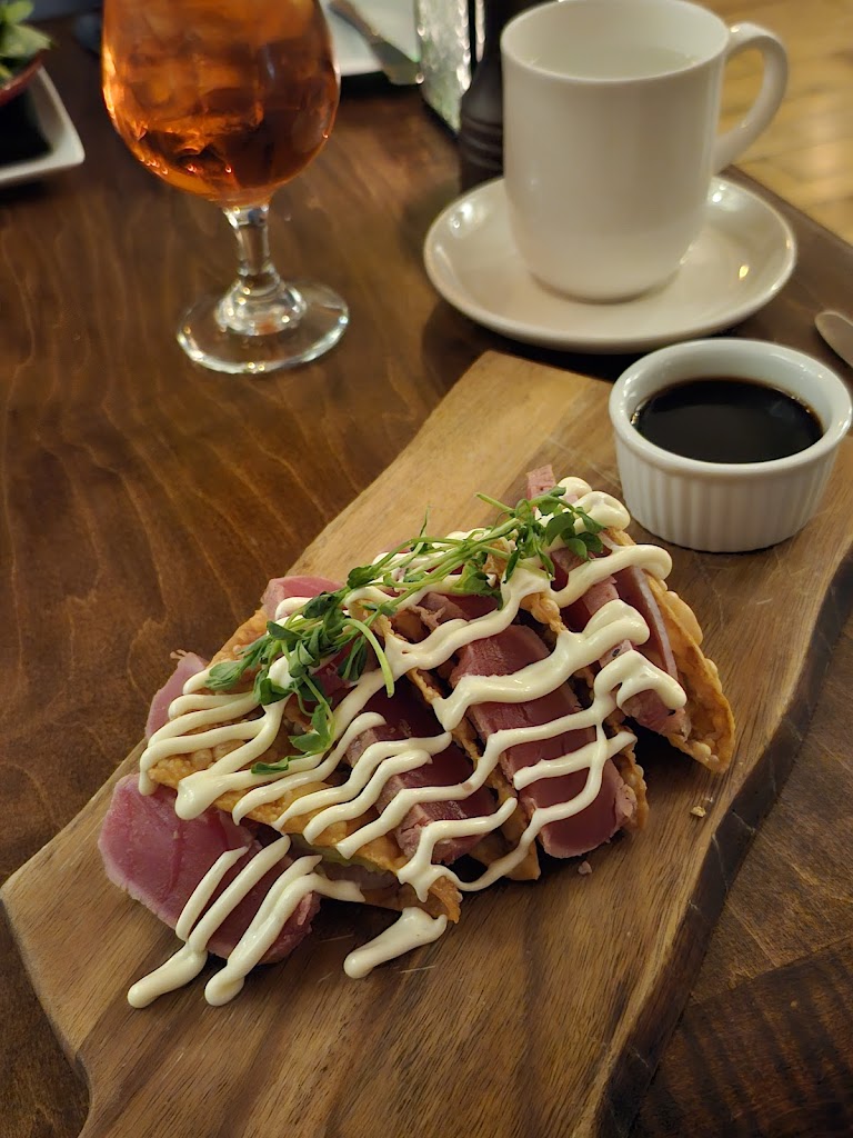 A superb light dinner for two. I will open by saying we don t normally eat a lot. Three shared appetizers were more than sufficient. We were across the road at The Shaw for a three act matinee. As we were early we had a great table on the veranda looking out onto Queen St. The Green salad was fresh with no wilted greens an a nice light vinaigrette dressing. The cheese board had a lovely selection of regional cheeses with crostini and fresh fruit. Our server Sean suggested the Ahi Tuna hands down. A perfect choice with watermelon radish and avocado topped with a very mild wasabi Mayo. We will be back!