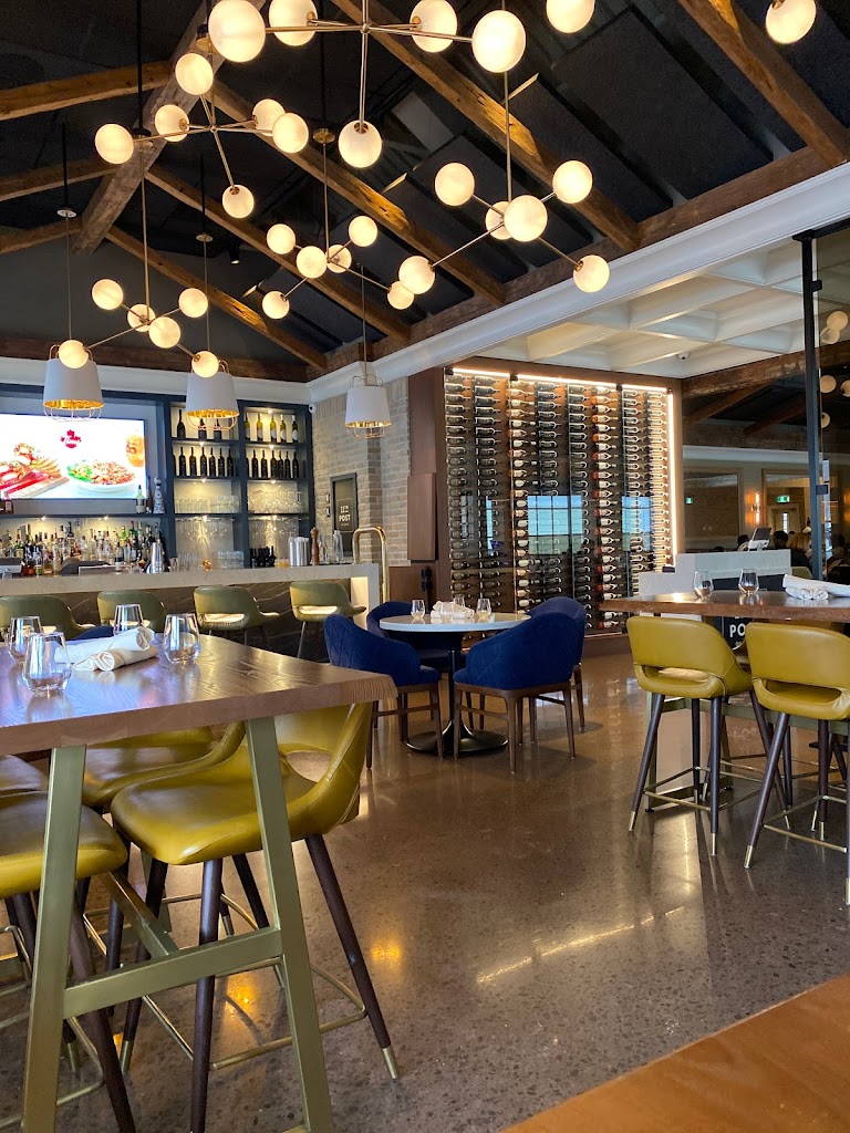 Décor outstanding. Food not so much. Fried chicken sandwich soggy with pickle juice, chicken tenders overcooked. Beef nachos inedible by all four of us - too many large jalapeño slices. Wine by the glass $22. They push you to order more.