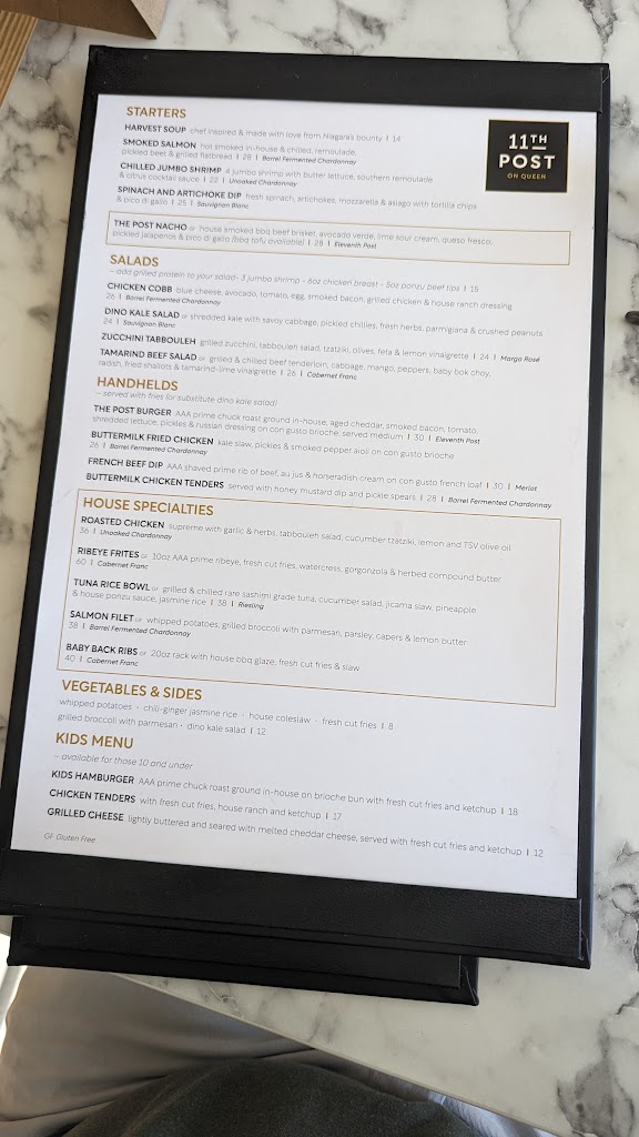 We recently dined at 11th Post on Queen attracted by its reputation as a high-end venue. Unfortunately, our experience fell short of expectations. The service was merely adequate, and the long wait to order was an inconvenience. Furthermore, the menu failed to mention that the salad contained coriander, an important detail for those of us who don t like it. We specifically mentioned that we would be sharing the beef dip, yet the restaurant provided condiments sufficient for only one person. On a positive note, the wine was good, which provided some consolation. Overall, the experience did not justify the high prices or meet the standard one would anticipate from a supposedly top-tier restaurant.