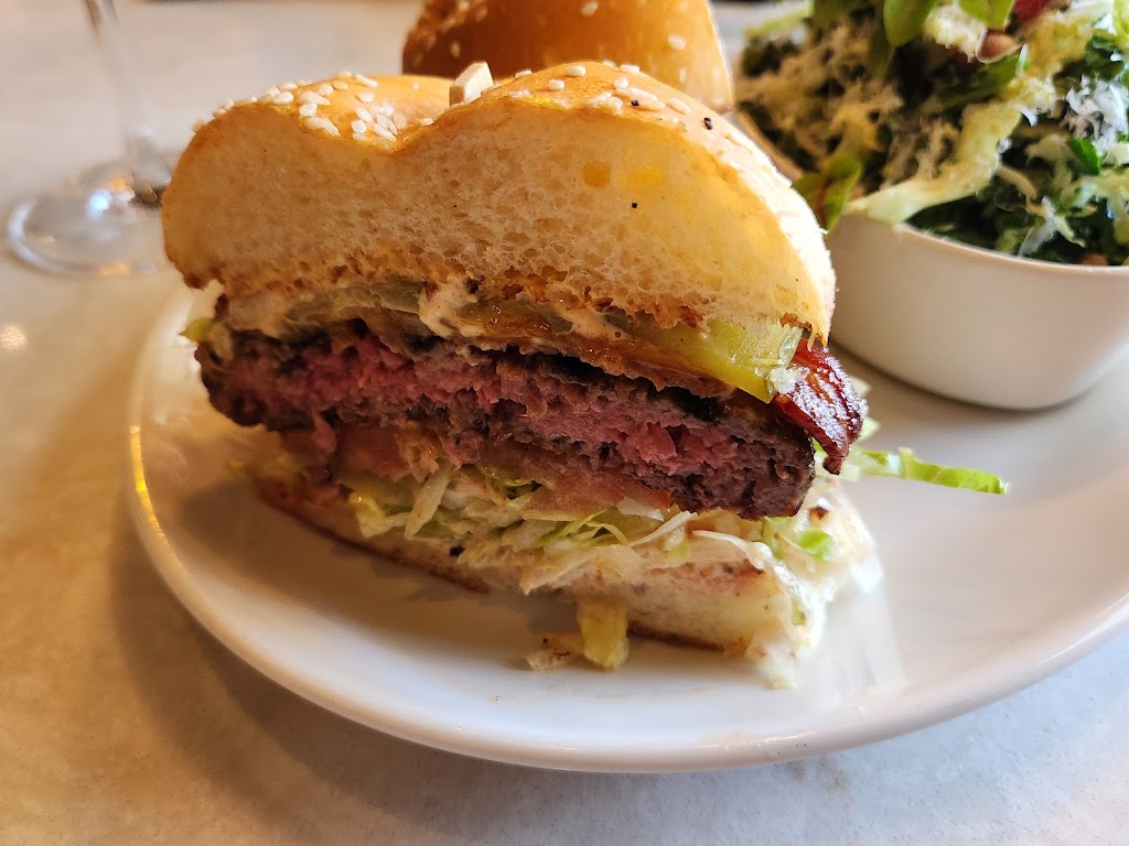 My partner had the beef salad and myself the post burger. Both tasty and well cooked. The burger s sauce was magical, and the patty is very juicy. My critic would be the amount of fries they serve with the burger is stupidly gigantic. Half that would have been plenty, a bit of salade instead would have been great to balance the plate. Thankfully my partner s salad was enormous too. Staff was impeccable.