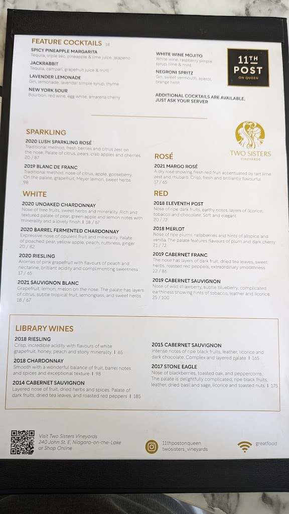 Newly opened but 11th Post is running up to speed already, the service here was great! We enjoyed our meal and the wines are from Two Sisters and are always good!. This is a good spot for lunch as you wander the shops of the historic downtown Niagra on the Lake town.