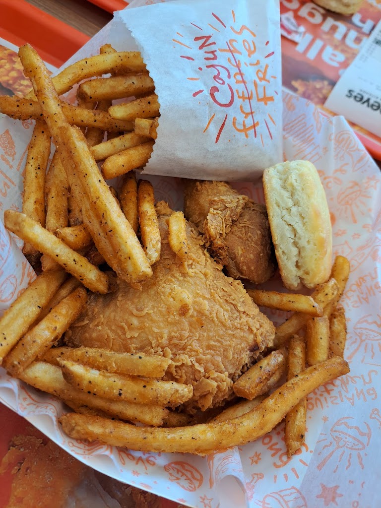 Best fast food chicken around. Best spicy fat food chicken around. Their fries are similarly spiced like Arbys (only they are straight). Strongly recommend downloading the app, crazy good deals on there. Food