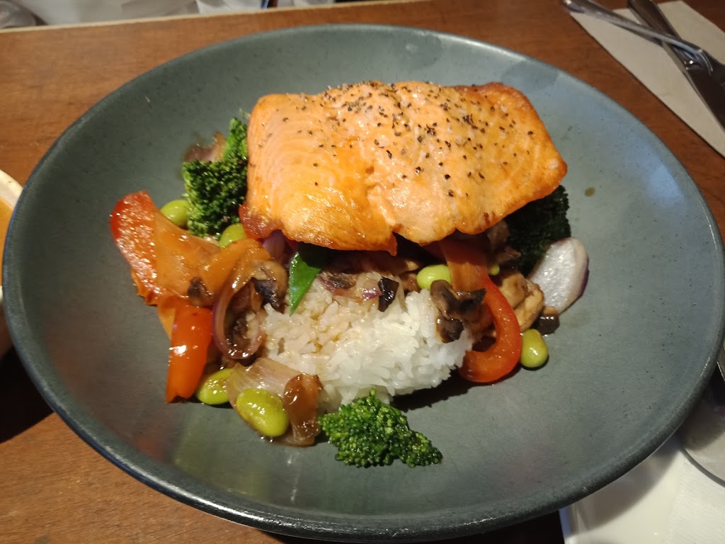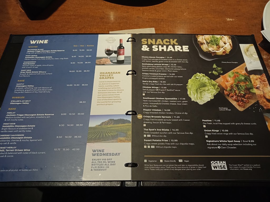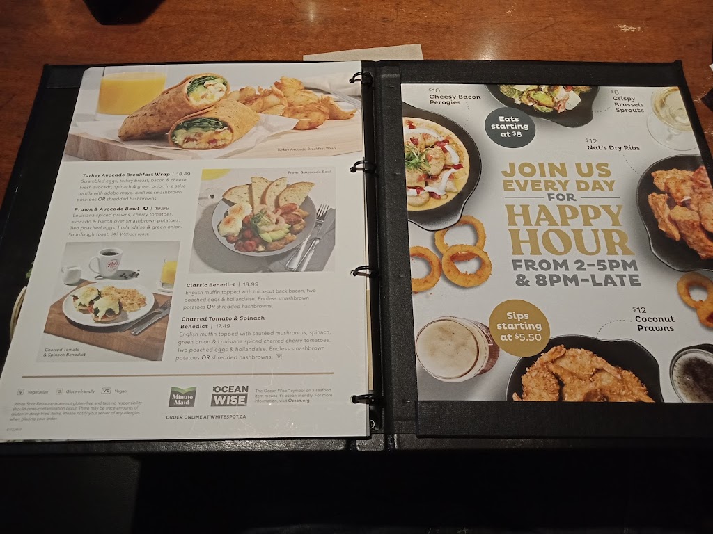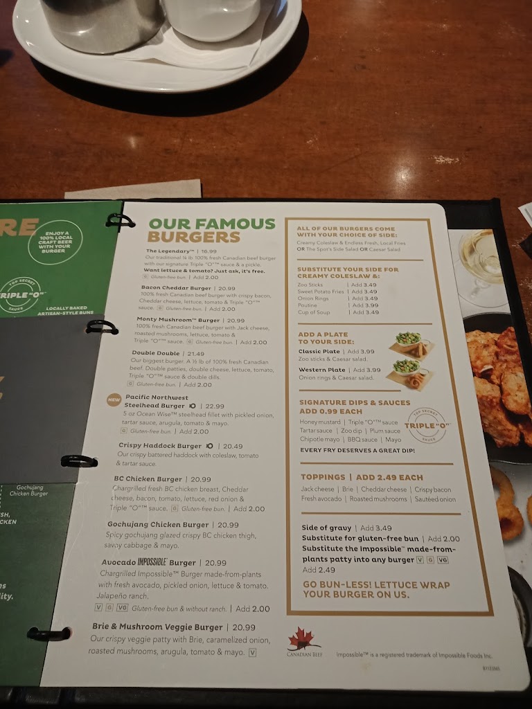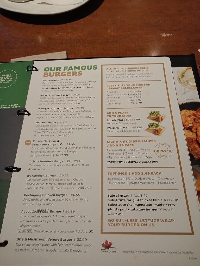 White Spot is an old favorite. Been going since I was a kid, and the menu has evolved beautifully over time with changing tastes. I would give it a 5 star if half fries half salad were put back on the menu as an option. I would be happy to pay the extra cost of a side salad and get half and half instead of doubling the side, which makes for waste..... just a thought! Vegetarian options: Had a nice selection of vegetarian options . More than just the one token item seen in many other places.