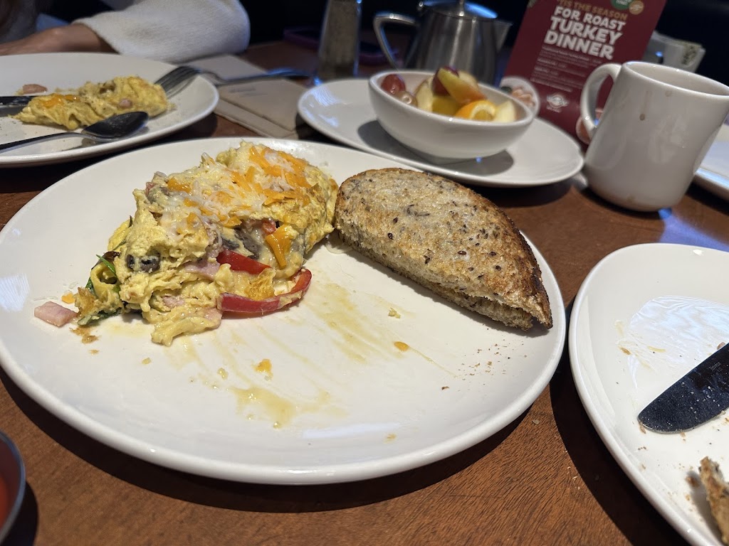 Food was good service was good except for the omelette was terrible and instructions were not followed but the manager apologized and took it off my bill