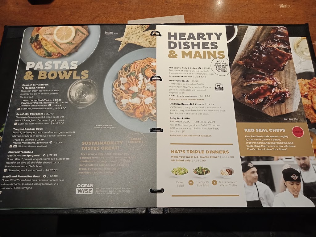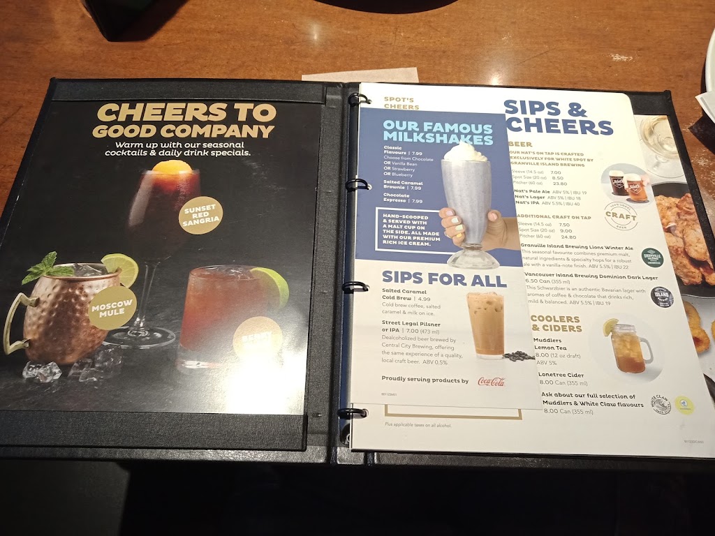 Sometimes slow service but 1 server in bar side has bad attitude. (Update now hes gone) Major rodent problem in parking lot area. Very serious. Im frankly disappointed with how the menu has been thrashed by the team that is obviously cutting back. Whitespot is cutting there best plates to cheap out. They took off seafood fettuccine alfredo. Omg it was probably the best and last good pasta plate left on the menu. Now they have replaced it with a sad shrimp plate. Very disappointing. White Spot youre starting to lose my business by cutting back way too much. Be smart add to your menu not take away.