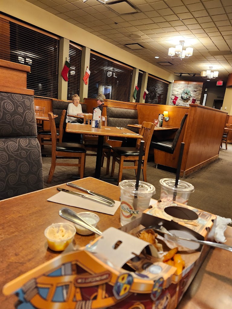 We picked the food up ( carry out) . I had a clubhouse with shrimp as an extra topping . It was massive and very good . My wife had a burger and also enjoyed her lunch . $52 though . Prices are crazy .