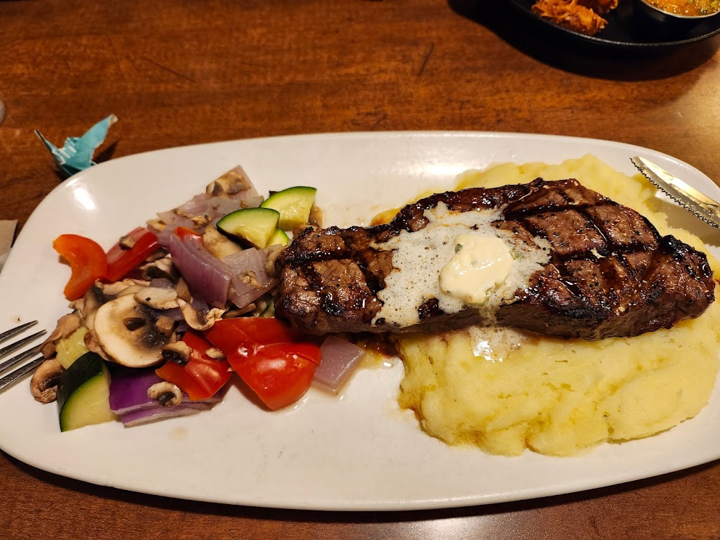 The medium-rare New York steak is delicious, it's $33 +tax. There are a happy hour meals menu thats is yummy too from 3-5pm, fried prawn for $12. They have kids menu too