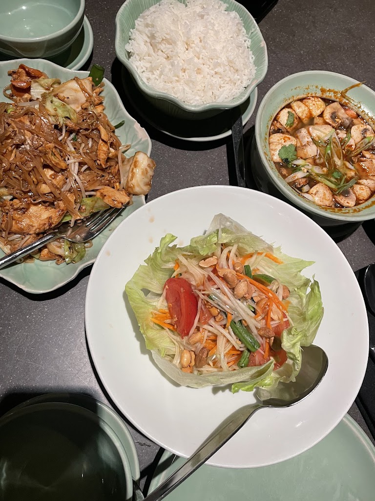 The food is OK but its not... Thai food? The Pad Thai tastes like its a weak tomato sauce on linguine. Tomato???? Its legitimately gross. The curries are good but have a very strong flavor profile that to me is more Chinese, although I cant identify it. Some of the dishes are fabulous. The lettuce wraps for instance, and the spicy chicken thighs. The issue is that the dishes that are very core to Thai cooking - Pad Thai, Tom Yum Gai - are really not good.