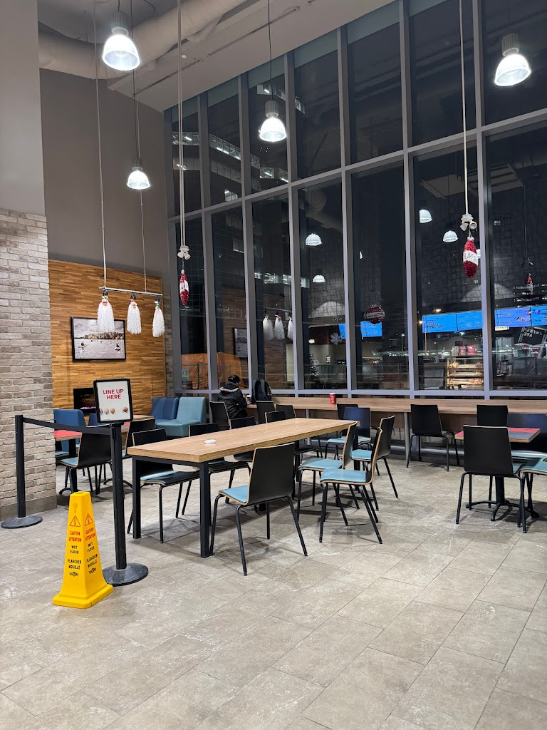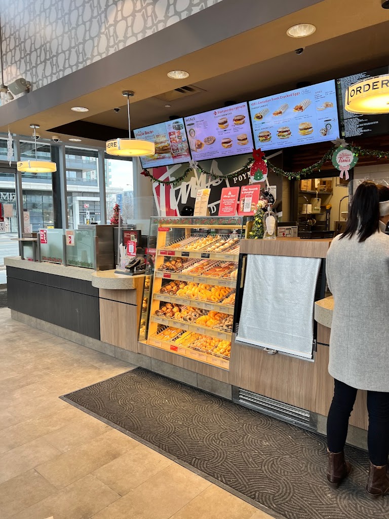 Purchased the pepperoni flatbread and waited around a little over 10 minutes. Which is a slightly bit longer than other Tim locations, but I was in no rush. After opening the box when the flatbread was completed, only the ends had cuts. The middle wasn’t cut at all. So I had to eat a larger slice instead. Not exactly a problem, but having 6 slices instead of 5 would’ve been nice. Atmosphere overall was okay; it’s close to the station which is convenient. However overall experience at this location could’ve been better