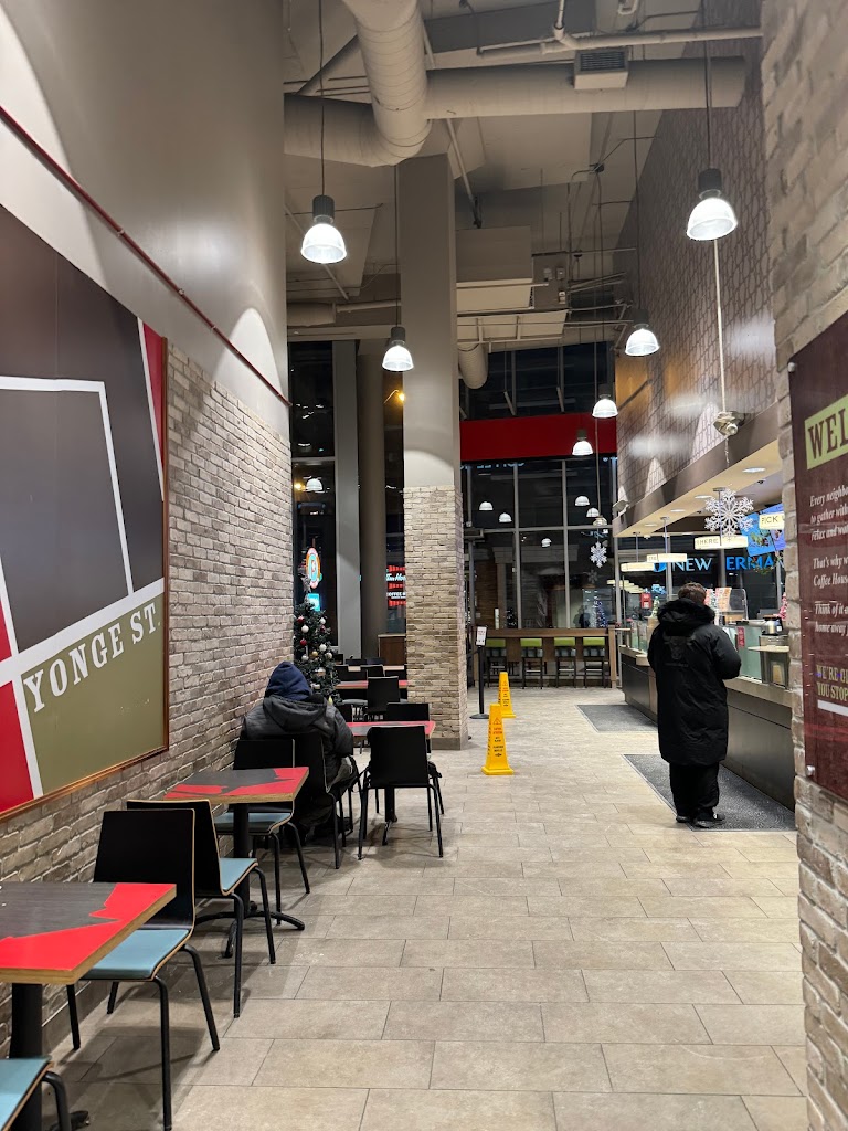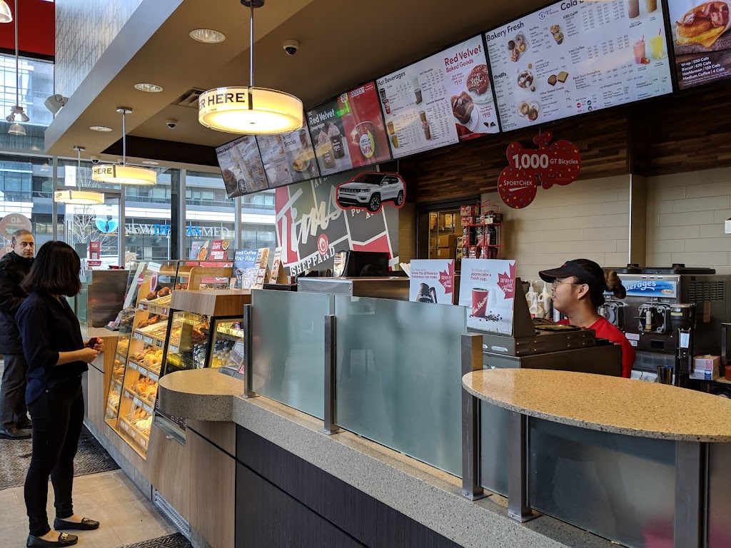 Large and spacious cafe that can accommodate a considerable group or bunch of folks. Situated a few meters away from the Sheppard- Yonge bus station and subway station. This joint of Tim Hortons does have a few couches if you wanna sip a coffee or a hot chocolate in a cozy spot near an artificial fireplace and really high ceilings. There is a GO bus stop right in front of this Tim Hortons adjoining the LCBO and Food Basics. The three stars is majorly due to the cleanliness of the space. Since this Tim Hortons open around 5ish, this is also a hotspot for homeless folks. The restrooms hence,are almost often a mess and unclean. Another short coming is a staff from the early morning crew, a middle aged / old Asian woman who is very rude to customers. I have personally felt the indifference many a time while being served. (Not to be confused with an energetic young Asian girl who recently joined the morning shifts)