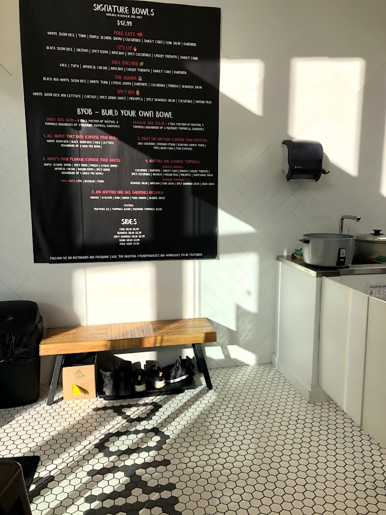 Small shop in the corner of a mall, taste wise their poke bowl was great, I wish they gave more options for the sides to pair with the protein. Overall a great meal. Their black rice base was also a nice touch as I've never had it before and I thoroughly enjoyed it! I highly recommend getting the black rice base if you can.